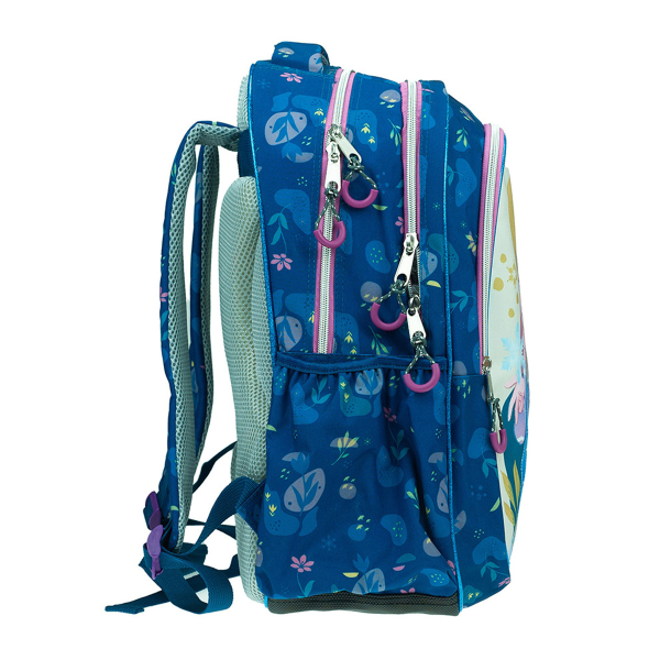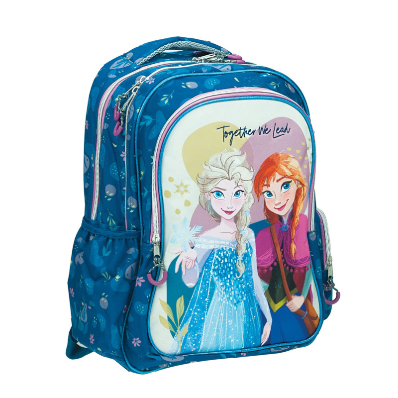 Σχολική τσάντα πλάτης δημοτικού σε μπλε χρώμα με βεραμάν λεπτομέρειες και σχέδιο από την ταινία Frozen της εταιρείας Gim. Με 3 θήκες για βιβλία, τετράδια, κασετίνα και όλα τα απαραίτητα είδη γραφής για το σχολείο. Ιδανική για την καθημερινή ασφαλή, άνετη και εύκολη μεταφορά όλων των απαραίτητων σχολικών ειδών.