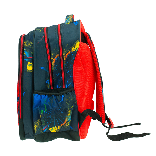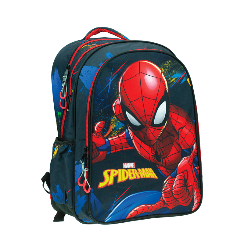 Σχολική τσάντα πλάτης δημοτικού σε μπλε χρώμα με κόκκινες λεπτομέρειες και τον ήρωα της Marvel Spiderman στο σχέδιο από την εταιρεία Gim. Με 3 θήκες για βιβλία, τετράδια, κασετίνα και όλα τα απαραίτητα είδη γραφής για το σχολείο. Ιδανική για την καθημερινή ασφαλή, άνετη και εύκολη μεταφορά όλων των απαραίτητων σχολικών ειδών.