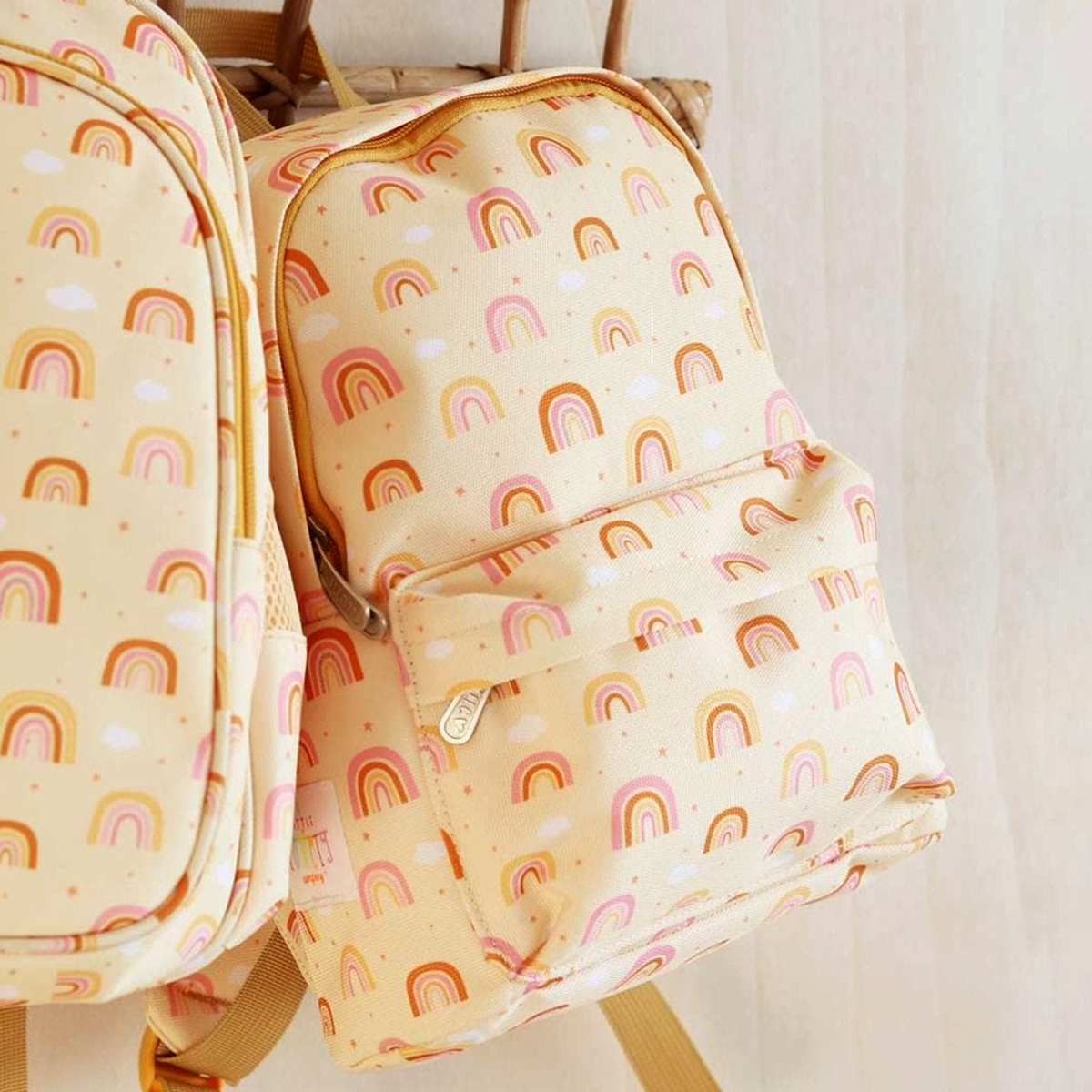 Με το σακίδιο της Little Lovely Company το παιδί σας θα ταξιδέψει στο κόσμο των ονείρων και του παραμυθιού για να δει λαμπερά ουράνια τόξα! Είναι κατασκευασμένο από ελαφρύ πολυεστερικό ύφασμα σε απόχρωση ώχρας. Έχει μία κεντρική θήκη που περιλαμβάνει μια εσωτερική τσέπη και μία μπροστινή τσέπη με εύκολο φερμουάρ. Διαθέτει ρυθμιζόμενους ιμάντες ώμου με επένδυση για άνεση και έξτρα λουρί που κουμπώνει για να τους διατηρεί σταθερούς. Στο πάνω μέρος του σακιδίου έχει λαβή για εύκολο πιάσιμο και μεταφορά.
