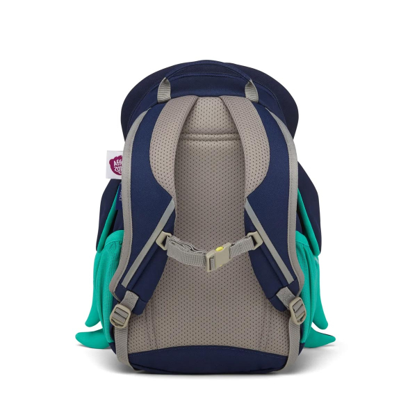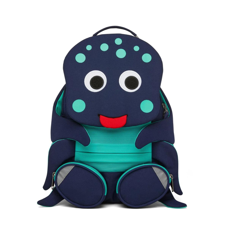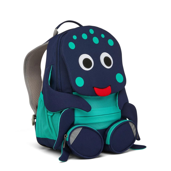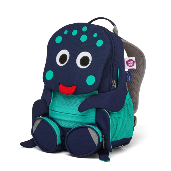 Σχολική τσάντα νηπιαγωγείου σε μπλε χρώμα και σχέδιο χταπόδι από την εταιρία Affenzahn. Είναι κατασκευασμένο από αδιάβροχο ύφασμα, ανθεκτικό στους λεκέδες και από ανακυκλωμένες φιάλες PET. Έχει χωρητικότητα 8 λίτρα και είναι κατάλληλο για παιδάκια ύψους από 93 έως 115 εκατοστά. Ο ιμάντας στήθους είναι ρυθμιζόμενος και βοηθάει τα λουριά της πλάτης να παραμένουν σταθερά, ακριβώς όπως και τα περιεχόμενα του σακιδίου. Διαθέτει ανακλαστήρες για μεγιστοποίηση της ασφάλειας στο σκοτάδι, αλλά και μια γερή λαβή για να μπορεί να κρεμαστεί οπουδήποτε. Τραβώντας την γλώσσα του δράκου στο μπροστινό μέρος, θα βρείτε μια ετικέτα για να σημειώσετε τα στοιχεία του κατόχου της τσάντας. Ιδανικό σακίδιο για το νηπιαγωγείο αλλά και τις βόλτες ή τις εκδρομές.