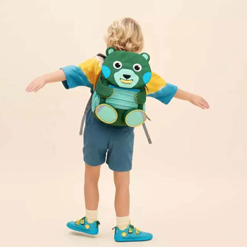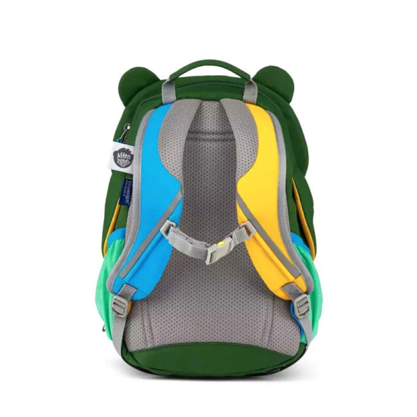 Σχολική τσάντα νηπιαγωγείου σε πράσινο χρώμα με σχέδιο αρκουδάκι και μπλε-κίτρινες λεπτομέρειες από την εταιρεία Affenzahn. Είναι κατασκευασμένο απο εγκεκριμένα υλικά bluesign® τα οποία πιστοποιούν ότι το προϊόν έχει κατασκευαστεί με 100% ανακυκλώσιμα υλικά και ειναι φιλικό προς το περιβάλλον. Έχουν χρησιμοποιηθεί 100% ανακυκλωμένα υφάσματα χωρίς την χημική ουσία pfc που χρησιμοποιειτε στα ενδύματα για αδιαβροχοποιηση και διαθέτει πιστοποίηση Gruner Knopf. Επίσης τα προιόντα παράγονται χωρίς απειλή για την υγεία των καταναλωτών και των εργαζομένων. Έχει χωρητικότητα 8 λίτρα και είναι κατάλληλο για παιδάκια ύψους από 93 έως 115 εκατοστά. Ο ιμάντας στήθους είναι ρυθμιζόμενος και βοηθάει τα λουριά της πλάτης να παραμένουν σταθερά, ακριβώς όπως και τα περιεχόμενα του σακιδίου. Διαθέτει ανακλαστήρες για μεγιστοποίηση της ασφάλειας στο σκοτάδι, αλλά και μια γερή λαβή για να μπορεί να κρεμαστεί οπουδήποτε. Τραβώντας την γλώσσα του δράκου στο μπροστινό μέρος, θα βρείτε μια ετικέτα για να σημειώσετε τα στοιχεία του κατόχου της τσάντας. Ιδανικό σακίδιο για το νηπιαγωγείο αλλά και τις βόλτες ή τις εκδρομές.