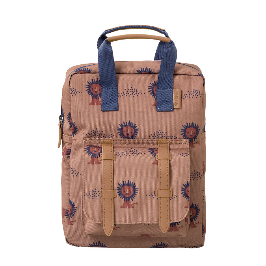 Τσάντα νηπιαγωγείου από την εταιρεία Fresk στην απόχρωση της τερακότας. Έχει χαριτωμένο σχέδιο με λιονταράκια. Είναι υφασμάτινη και κατασκευάζεται από ανακυκλωμένα μπουκάλια PET. Το σακίδιο πλάτης έχει χωρίσματα ώστε το παιδί να μπορεί να τοποθετεί τα πράγματα του με ευκολία και ασφάλεια. Διαθέτει μια ευρύχωρη κύρια θήκη με φερμουάρ, η οποία είναι αρκετά μεγάλη ώστε να χωρέσει ένα φαγητοδοχείο μεσημεριανού γεύματος, παιχνίδια και πολλά άλλα αντικείμενα. Έχει ειδικό τμήμα εσωτερικά έτσι ώστε να τοποθετεί το ποτηράκι του, ή το παγούρι του και να παραμένει στη θέση του. Επιπλέον, έχει και μπροστινή θήκη που ασφαλίζει αυτόματα με μαγνήτη. Διαθέτει ρυθμιζόμενους ιμάντες ώμου και στοιχεία από δερματίνη που της δίνει μια ιδιαίτερη εμφάνιση. Οι θηλιές στο επάνω μέρος καθιστούν εύκολη και γρήγορη τη μεταφορά. Ιδανική τσάντα για τον παιδικό σταθμό, το νηπιαγωγείο, την εκδρομή ή οποιαδήποτε άλλη δραστηριότητα.