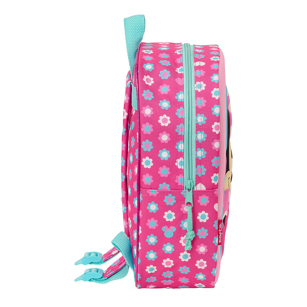 Τσάντα νηπιαγωγείου από την εταιρεία Safta. Έχει ροζ χρώμα και την ηρωίδα της Disney Minnie στο σχέδιο. Το σχέδιο είναι ανάγλυφο. Είναι κατασκευασμένη από 100% polyester. Διαθέτει μια ευρύχωρη κύρια θήκη που κλείνει με φερμουάρ. Είναι αρκετά μεγάλη ώστε να χωρέσει ένα φαγητοδοχείο μεσημεριανού γεύματος, παιχνίδια και πολλά άλλα αντικείμενα. Έχει μία πλαϊνή θήκη με δίχτυ κατάλληλη για παγούρι. Η επιφάνεια της πλάτης, έχει εσωτερική επένδυση ώστε να αποφεύγονται τραυματισμοί. Διαθέτει μαξιλαράκια ώμου με επένδυση Anti-sweat για άνεση και λιγότερο ιδρώτα. Η θηλιά στο επάνω μέρος καθιστά εύκολη τη μεταφορά. Ιδανική τσάντα για τον παιδικό σταθμό, το νηπιαγωγείο, την εκδρομή ή οποιαδήποτε άλλη δραστηριότητα. Χωρητικότητας 6 λίτρα.