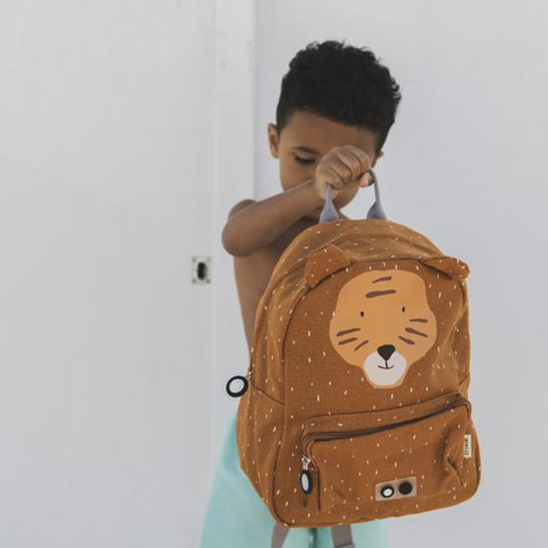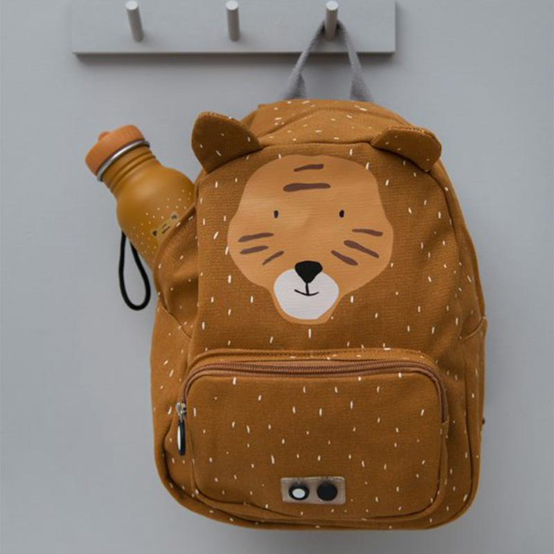 Παιδικό σακίδιο πλάτης σε καφέ χρώμα και σχέδιο τίγρη της εταιρίας Trixie. Κατασκευασμένο από 100% βαμβάκι που το καθιστά αρκετά μαλακό και ανθεκτικό. Διαθέτει ρυθμιζόμενους και επενδυμένους ιμάντες ώμου για να προσαρμόζεται στην πλάτη του μικρού σας, ενώ η κοντή λαβή στο πάνω μέρος της τσάντας, διευκολύνει στο να την κρεμάτε εύκολα παντού. Ο ιμάντας στήθους εμποδίζει τους ιμάντες ώμου να πέσουν κάτω. Η μεγάλη και κύρια μπροστινή τσέπη κλείνει με φερμουάρ για να μπορεί το μικρό σας να την ανοιγοκλείνει με ευκολία, ενώ η μικρή μπροστινή τσέπη είναι ιδανική για να αποθηκεύσετε μικρά σνακ. Η ετικέτα ονόματος που διαθέτει στο εσωτερικό της η τσάντα, είναι ιδανική για να γράψετε το όνομα του μικρού σας για να μην την χάσει. Η τσάντα είναι υδατοαπωθητική και πλένεται εύκολα στο πλυντήριο. Ωστόσο όσες περισσότερες φορές την πλύνετε, τόσο λιγότερο νερό θα απωθεί. Ιδανικό σακίδιο για το σχολείο, τις εκδρομές και ότι άλλο επιθυμείτε.