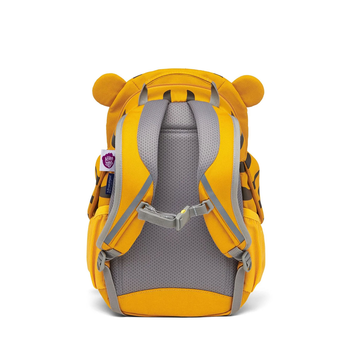 Σχολική τσάντα νηπιαγωγείου σε κίτρινο χρώμα, με καφέ λεπτομέρειες και σχέδιο τιγράκι από την εταιρεία Affenzahn. Είναι κατασκευασμένο από αδιάβροχο ύφασμα, ανθεκτικό στους λεκέδες και από ανακυκλωμένες φιάλες PET. Έχει χωρητικότητα 8 λίτρα. Ο ιμάντας στήθους είναι ρυθμιζόμενος και βοηθάει τα λουριά της πλάτης να παραμένουν σταθερά, ακριβώς όπως και τα περιεχόμενα του σακιδίου. Διαθέτει ανακλαστήρες για μεγιστοποίηση της ασφάλειας στο σκοτάδι, αλλά και μια γερή λαβή για να μπορεί να κρεμαστεί οπουδήποτε. Τραβώντας την γλώσσα του δράκου στο μπροστινό μέρος, θα βρείτε μια ετικέτα για να σημειώσετε τα στοιχεία του κατόχου της τσάντας. Ιδανικό σακίδιο για το νηπιαγωγείο αλλά και τις βόλτες ή τις εκδρομές.