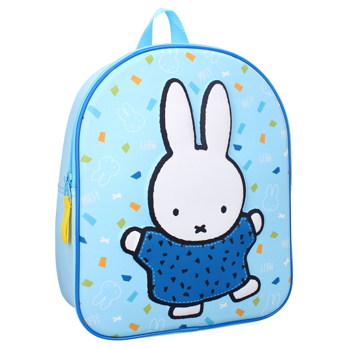 Τσάντα νηπιαγωγείου από την εταιρεία Miffy. Έχει γαλάζιο χρώμα με πράσινες-πορτοκαλί λεπτομέρειες και σχέδιο κουνελάκι. Είναι κατασκευασμένη από 100% polyester που προσφέρει αντοχή στο νερό και ευκολία στο καθάρισμα. Διαθέτει μια ευρύχωρη κύρια θήκη με δύο φερμουάρ και είναι αρκετά μεγάλη ώστε να χωρέσει ένα φαγητοδοχείο μεσημεριανού γεύματος, παιχνίδια και πολλά άλλα αντικείμενα. Επιπλέον, έχει και μπροστινή τσέπη με φερμουάρ. Οι ρυθμιζόμενοι ιμάντες και η επιφάνεια της πλάτης, έχουν εσωτερική επένδυση ώστε να αποφεύγονται τραυματισμοί. Η θηλιά στο επάνω μέρος καθιστά επίσης εύκολη τη μεταφορά. Ιδανική τσάντα για τον παιδικό σταθμό, το νηπιαγωγείο, την εκδρομή ή οποιαδήποτε άλλη δραστηριότητα.