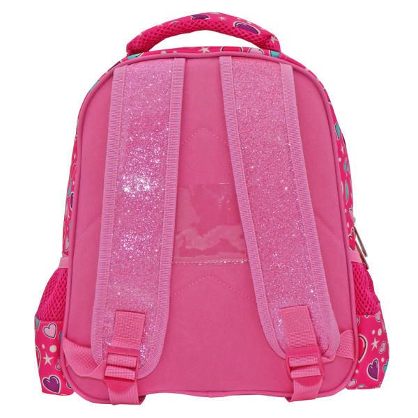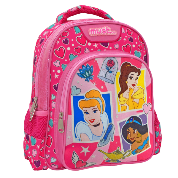 Σχολική τσάντα πλάτης νηπιαγωγείου σε φούξια χρώμα με πολύχρωμες λεπτομέρειες και σχέδιο με γκλίτερ που απεικονίζει πριγκίπισσες της Disney, από την εταιρεία Must. Με 2 θήκες για βιβλία, τετράδια, κασετίνα και όλα τα απαραίτητα είδη γραφής για το σχολείο. Ιδανική για την καθημερινή ασφαλή, άνετη και εύκολη μεταφορά όλων των απαραίτητων σχολικών ειδών.