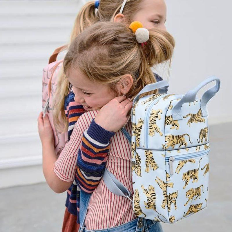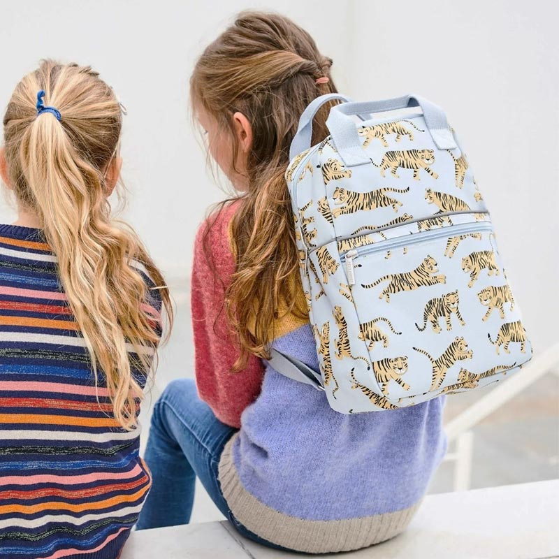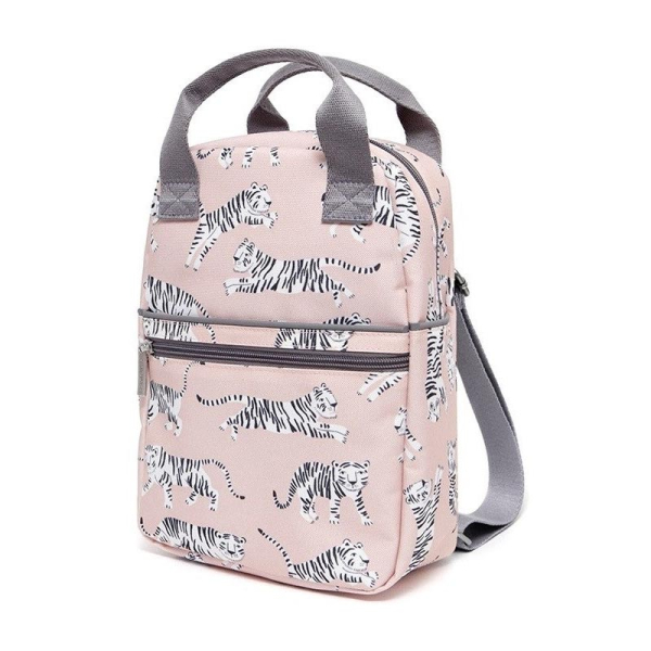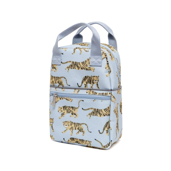 Τσάντα σχολική νηπιαγωγείου σε γκρι χρώμα και σχέδιο τίγρη από την εταιρία Petit Monkey. Είναι κατασκευασμένη από ανακυκλωμένα μπουκάλια PET για να συμβάλλουμε όλοι στην προστασία του περιβάλλοντος. (Το PET είναι το υλικό κατασκευής των πλαστικών μπουκαλιών και είναι 100% ανακυκλώσιμο. Τα μπουκάλια που ανακυκλώνονται, συλλέγονται, επεξεργάζονται για να γίνουν πάλι μπουκάλια ή μια ειδική ίνα με την οποία κατασκευάζονται διάφορα χρηστικά καθημερινά αντικείμενα). Διαθέτει επιπλέον μεγάλη τσέπη στο μπροστινό μέρος για την αποθήκευση μικροαντικειμένων όπως μαντηλάκια ενώ κλείνει με 2 φερμουάρ. Στο πλάι διαθέτει και θήκη για μπουκάλια, παγούρια κτλ. Οι ιμάντες αυξομειώνονται για να προσαρμόζονται εύκολα και οι 2 λαβές στο πάνω μέρος την καθιστούν εύκολη στο κρέμασμα αλλά και στο κράτημα. Είναι ιδανική για το νηπιαγωγείο αλλά και για εκδρομές, βόλτες ή ταξίδια. Κατάλληλη για ηλικίες έως 7 ετών.