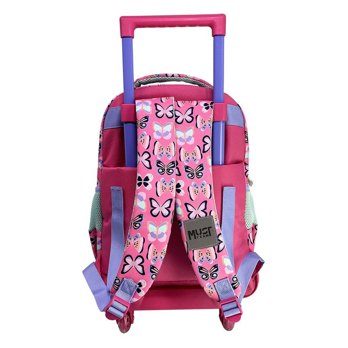 Σχολική τσάντα δημοτικού σε ροζ χρώμα με βεραμάν λεπτομέρειες και σχέδιο πεταλούδες από την εταιρεία Must που συνδυάζει σακίδιο πλάτης και τρόλεϊ μαζί. Με 3 θήκες για βιβλία, τετράδια, κασετίνα και όλα τα απαραίτητα είδη γραφής για το σχολείο. Ιδανική για την καθημερινή ασφαλή, άνετη και εύκολη μεταφορά όλων των απαραίτητων σχολικών ειδών.