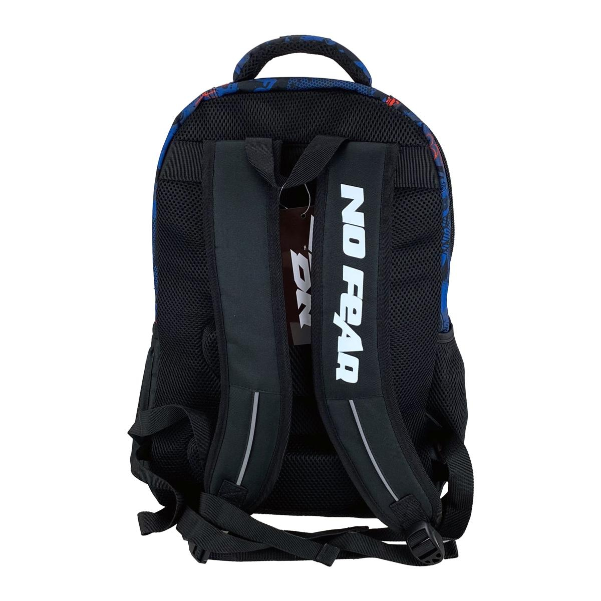 Σχολική τσάντα πλάτης για όλες τις σχολικές τάξεις της εταιρείας No Fear σε μπλε χρώμα με κόκκινες λεπτομέρειες και μοντέρνο σχέδιο. Με 3 θήκες για βιβλία, τετράδια, κασετίνα και όλα τα απαραίτητα είδη γραφής για το σχολείο. Ιδανική για την καθημερινή ασφαλή, άνετη και εύκολη μεταφορά όλων των απαραίτητων σχολικών ειδών.