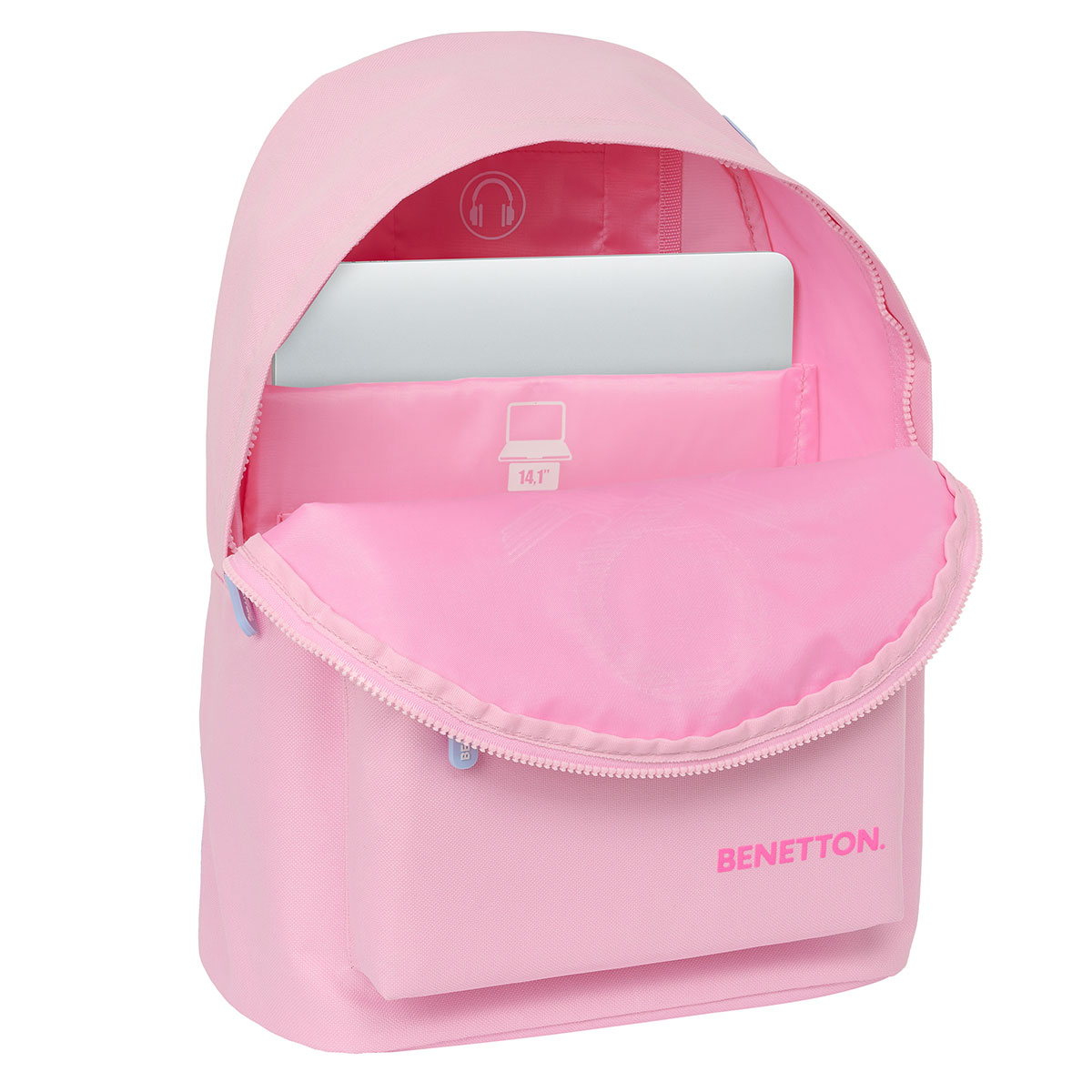 Σχολική τσάντα πλάτης για όλες τις σχολικές τάξεις από την εταιρεία Benetton. Έχει ροζ χρώμα με πολύχρωμες λεπτομέρειες και μοντέρνο σχέδιο. Είναι κατασκευασμένη από 100% polyester. Έχει 2 θήκες για βιβλία, τετράδια, κασετίνα και όλα τα απαραίτητα είδη γραφής για το σχολείο. Εσωτερικά έχει θήκη για laptop μεγέθους έως 14.1". Κατάλληλη τσάντα για καθημερινή ασφαλή, άνετη και εύκολη μεταφορά όλων των απαραίτητων σχολικών ειδών. Χωρητικότητας 20 λίτρα.