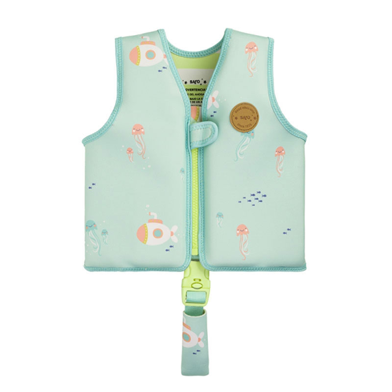 Παιδικό γιλέκο κολύμβησης από την εταιρεία Saro σε τυρκουάζ χρώμα με μοντέρνο στο σχέδιο. Είναι κατασκευασμένο από 90% νεοπρένιο και 10% polyester. Διαθέτει 8 κομμάτια επίπλευσης που μπορούν να αφαιρεθούν σιγά σιγά καθώς βελτιώνεται η ικανότητα του μικρού σας να επιπλέει χωρίς βοήθεια, απολαμβάνοντας την παραλία ή την πισίνα και εγγυάται την ασφάλειά του. Επίσης διαθέτει ρυθμιζόμενο λουράκι με επένδυση και ασφαλές κλείσιμο για να μπαίνει ανάμεσα στα πόδια, ώστε το γιλέκο να παραμένει στη θέση του και να μην γλιστράει πάνω από το κεφάλι του ενώ παίζει στο νερό. Είναι ευχάριστο και απαλό στην αφή, καθιστώντας το πολύ άνετο στη χρήση. Είναι κατάλληλο για παιδιά ηλικίας 3-6 ετών και βάρος 18-30 κιλά. *Προσοχή! Για την ασφάλεια του παιδιού σας, μην το αφήνετε χωρίς επίβλεψη. Αυτό είναι ένα βοήθημα επίπλευσης και όχι σωσίβιο*