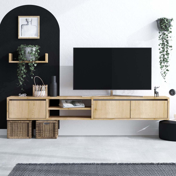 Κονσόλα τηλεόρασης επιτοίχια σε φυσική απόχρωση ξύλου με μοντέρνο σχεδιασμό. Με 2 ντουλάπια και 2 ράφια για επιπλέον αποθηκευτικό χώρο. Είναι κατασκευασμένη από μοριοσανίδα πάχους 18mm επενδυμένη με μελαμίνη. Η σύνθεση περιλαμβάνει ένα ράφι τοίχου που μπορείτε να τοποθετήσετε πάνω από το έπιπλο. Μέγιστο βάρος αντοχής: 20kg *Το σύνθετο σαλονιού έρχεται αμοντάριστο και συναρμολογείται βάσει οδηγιών.*