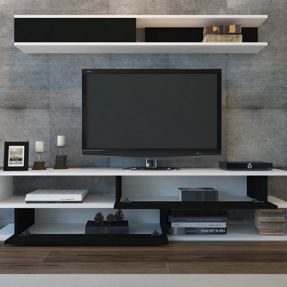 Κονσόλα τηλεόρασης σε λευκό και μαύρο χρώμα με μοντέρνο σχεδιασμό. Διαθέτει 2 ντουλάπια και 2 ράφια για επιπλέον αποθηκευτικό χώρο. Είναι κατασκευασμένη από μοριοσανίδα πάχους 18mm επενδυμένη με μελαμίνη. Η σύνθεση περιλαμβάνει και μία ραφιέρα τοίχου, στο ίδιο χρώμα, που μπορείτε να τοποθετήσετε πάνω από το έπιπλο. *Μέγιστο βάρος αντοχής: 25 kg *Το σύνθετο σαλονιού έρχεται αμοντάριστο και συναρμολογείται βάσει οδηγιών.*