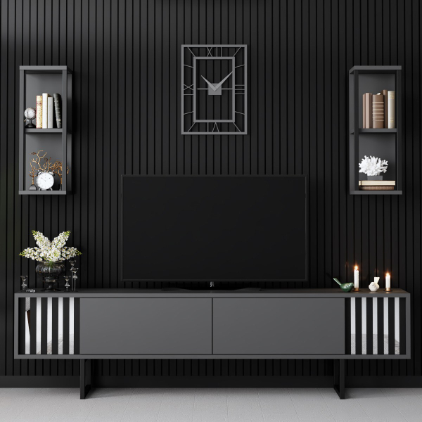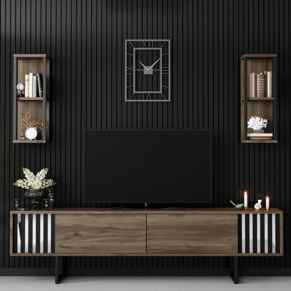 Κονσόλα τηλεόρασης σε απόχρωση καρυδιάς με μοντέρνο σχεδιασμό. Διαθέτει 2 ντουλάπια με καθρέφτη για επιπλέον αποθηκευτικό χώρο. Είναι κατασκευασμένη από μοριοσανίδα πάχους 18mm επενδυμένη με μελαμίνη και έχει μαύρες μεταλλικές λεπτομέρειες. Η σύνθεση περιλαμβάνει 2 ραφιέρες τοίχου, στο ίδιο χρώμα, που μπορείτε να τοποθετήσετε πάνω από το έπιπλο. *Μέγιστο βάρος αντοχής: 30kg *Το σύνθετο σαλονιού έρχεται αμοντάριστο και συναρμολογείται βάσει οδηγιών.*
