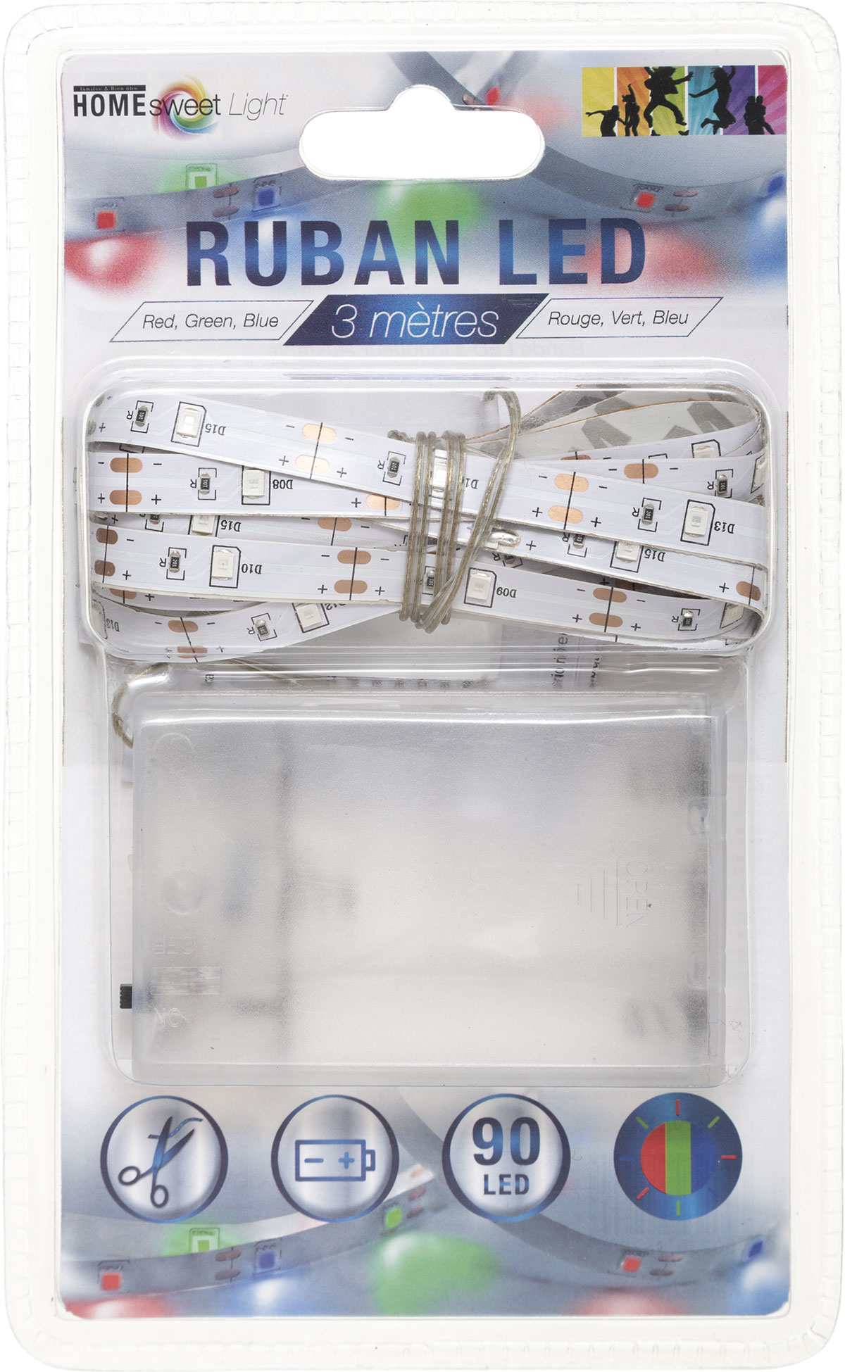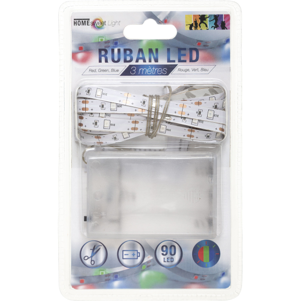 Διακοσμητική led ταινία με 90 Led φωτάκια πολύχρωμου φωτός. Είναι κατασκευασμένη από πλαστικό υλικό και λειτουργεί με 3 μπαταρίες AA LR6, οι οποίες δεν περιλαμβάνονται. Το συνολικό μήκος της ταινίας είναι 330εκ. Κολλάει στις επιφάνειες που θέλετε με ταινία 3Μ που διαθέτει στο πίσω της μέρος και ειναι ιδανική για τοποθέτηση περιμετρικά από καθρέφτες, πίσω από την τηλεόραση σαν κρυφό φωτισμό κλπ.