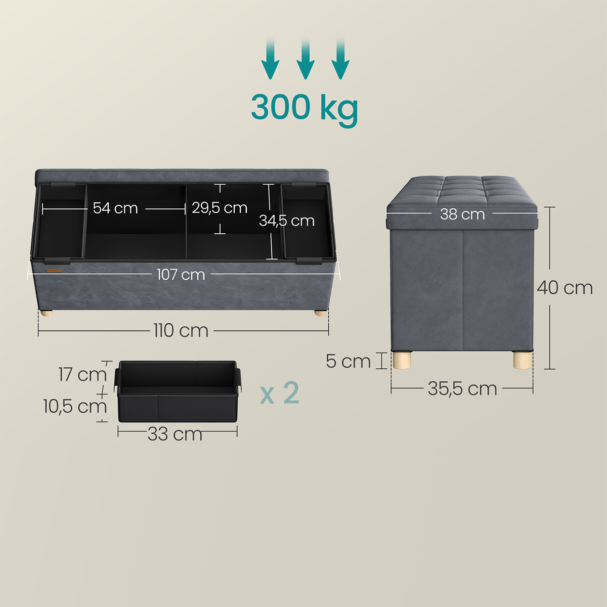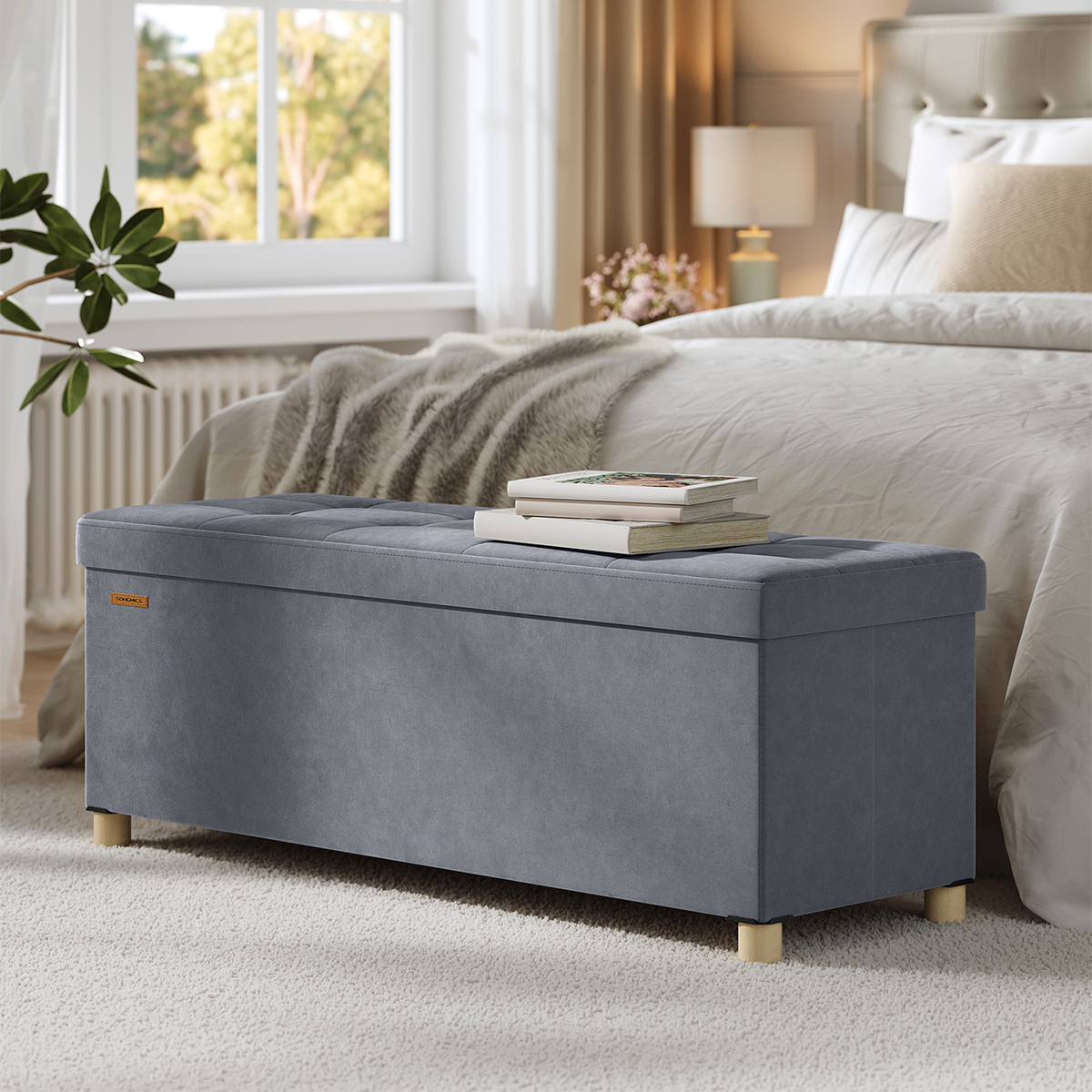 Παγκάκι με μοντέρνο σχεδιασμό, από την εταιρεία Songmics. Είναι επενδυμένο με ύφασμα σε γκρι χρώμα. Ο σκελετός είναι κατασκευασμένος από μοριοσανίδα, ενώ η εσωτερική γέμιση είναι από αφρό πολυουρεθάνης. Στο κάτω μέρος διαθέτει αποθηκευτικό χώρο, με αφαιρούμενα χωρίσματα. Ιδανικό παγκάκι που θα προσφέρει ένα έξτρα κάθισμα στο χώρο σας και επιπλέον αποθηκευτικό χώρο στο σπίτι σας. Μέγιστο βάρος αντοχής: 300kg.