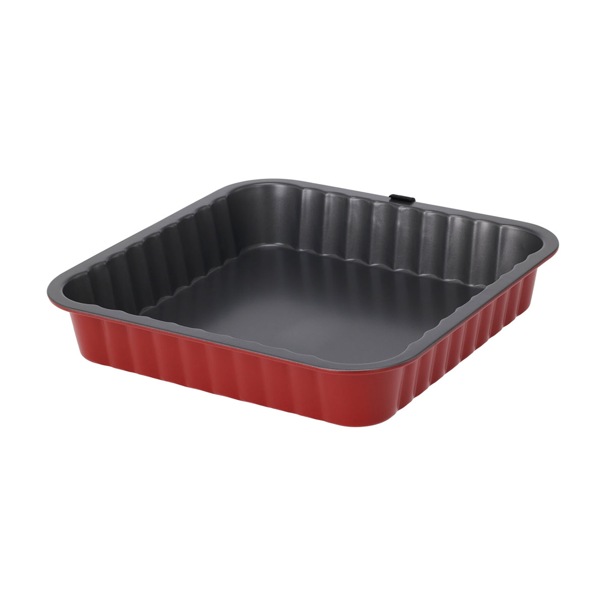 Τετράγωνη φόρμα ζαχαροπλαστικής για τάρτες, από ανθρακούχο χάλυβα πάχους 4mm που προσφέρει εξαιρετική θερμοαγωγικότητα και ομοιόμορφο ψήσιμο. Έχει αντικολλητική επίστρωση που προσφέρει εύκολη αφαίρεση της τάρτας από την φόρμα και εύκολο καθάρισμα. Η εσωτερική επίστρωση έχει ανθρακί χρώμα και εξωτερικά είναι κόκκινη.
