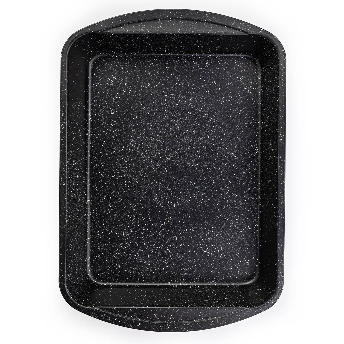 Ορθογώνιο ταψί από την εταιρεία εstia. Σώμα από ανθρακούχο χάλυβα πάχους 0.5mm που προσφέρει εξαιρετική θερμοαγωγικότητα και ομοιόμορφο ψήσιμο λόγω της ιδανικής κατανομής πάχους. Τριπλή μαρμάρινη αντικολλητική επίστρωση GOLDFLON που προσφέρει αντικολλητικές ιδιότητες που συναρπάζουν. Η επίστρωση έχει ως βάση το γκρι χρώμα ώστε να μην κιτρινίζει ποτέ, ακόμα και με τα δυσκολότερα όξινα υλικά. Κατάλληλο για φούρνο αέρα και φούρνο πάνω κάτω.