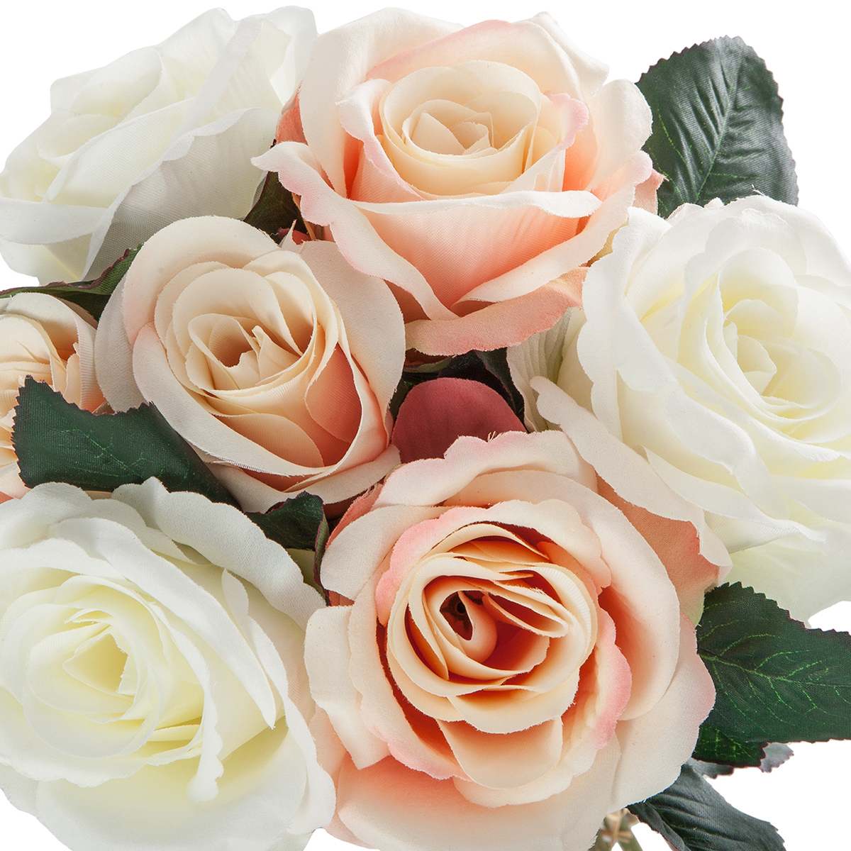 Tεχνητό μπουκέτο με τριαντάφυλλα κατασκευασμένο από πλαστικό υλικό και polyester σε λευκό και ροζ χρώμα. Διαθέτουν σύρμα στο εσωτερικό τους για να στέκονται. Χρησιμοποιήστε ψεύτικα φυτά για να διακοσμήσετε μέσα σε ένα βάζο και να αλλάξετε την διάθεση του εσωτερικού ή του εξωτερικού σας χώρου.