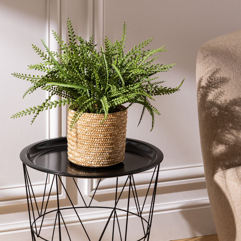 Τεχνητό φυτό κατασκευασμένο από πλαστικό υλικό σε πράσινο χρώμα. Είναι τοποθετημένο σε ψάθινη γλάστρα με μπεζ χρώμα. Χρησιμοποιήστε τεχνητά φυτά για να διακοσμήσετε όλα τα δωμάτια και τη βεράντα του σπιτιού σας και να αλλάξετε την διάθεση του εσωτερικού ή εξωτερικού σας χώρου.