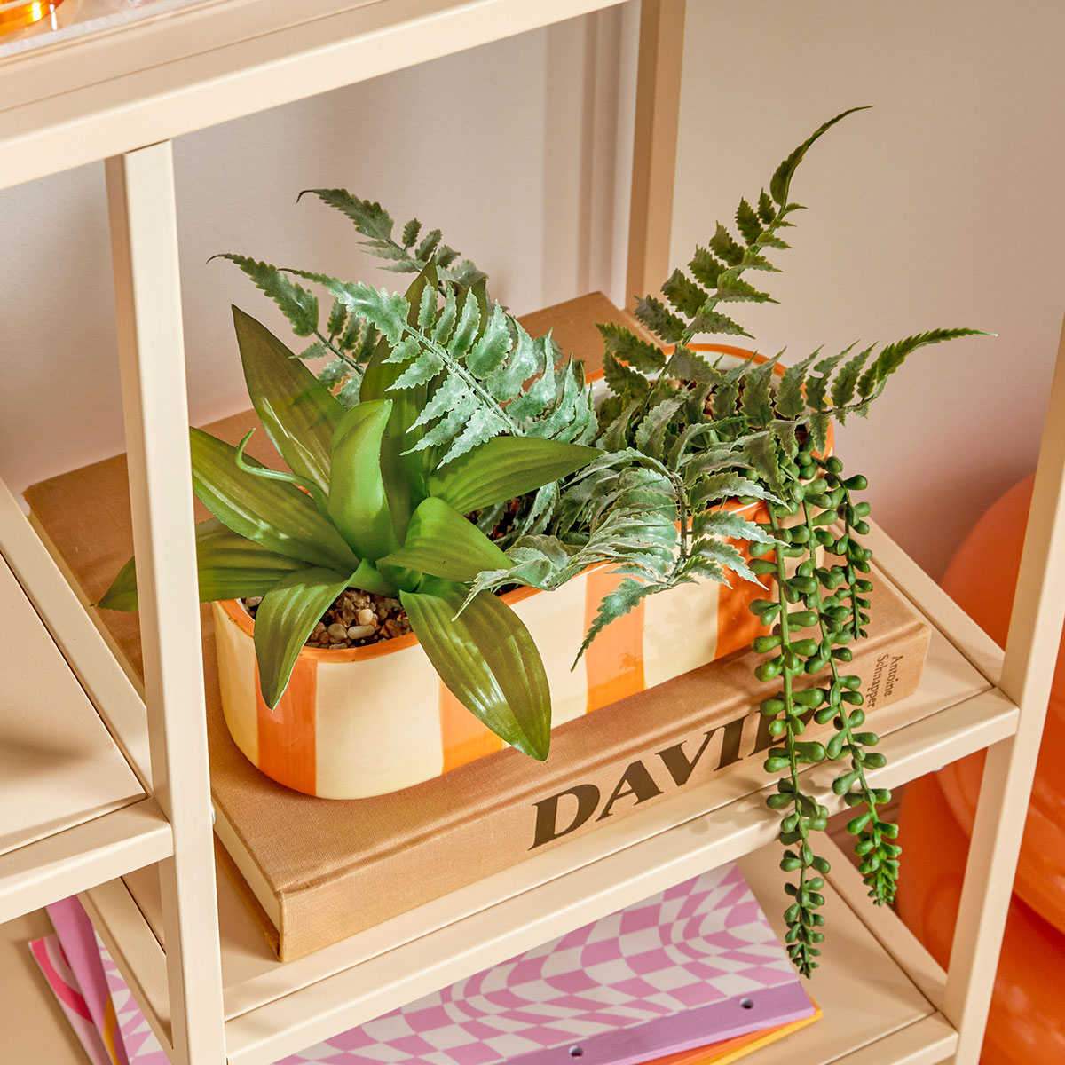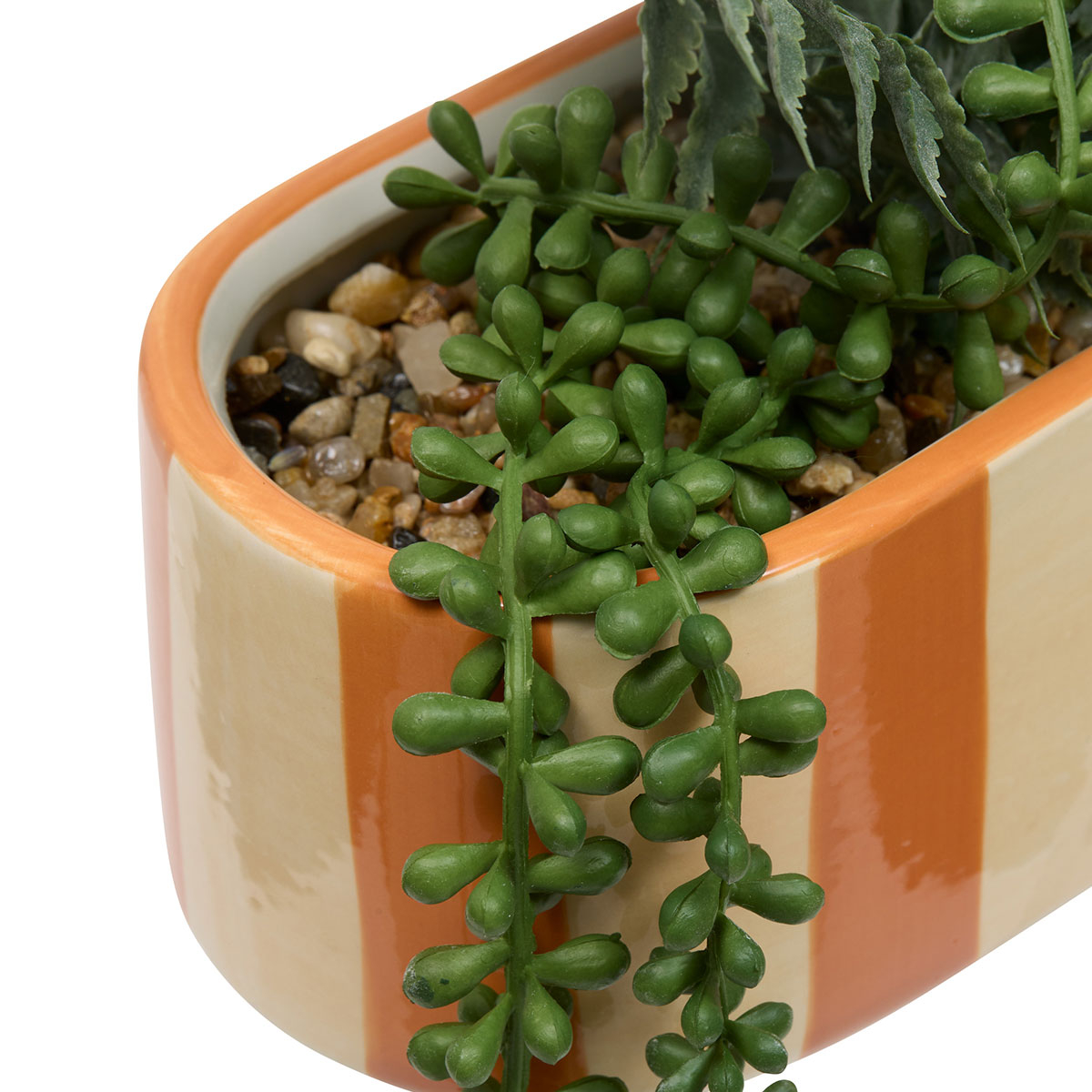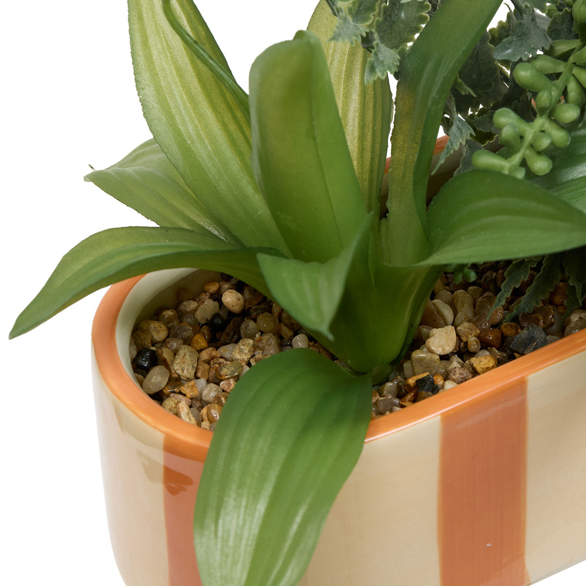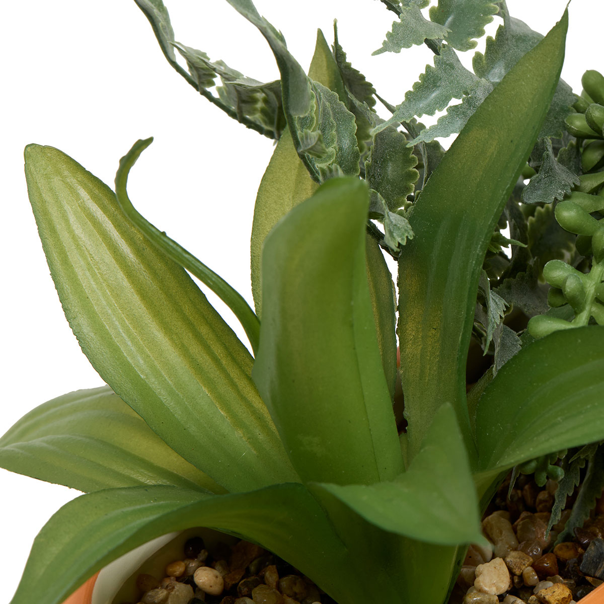 Τεχνητό φυτό σε γλάστρα με διάφορα παχύφυτα από πλαστικό υλικό. Το γλαστράκι είναι κεραμικό σε πορτοκαλί αποχρώσεις. Χρησιμοποιήστε τεχνητά φυτά και λουλούδια για να ανανεώσετε την διακόσμηση του χώρου σας.
