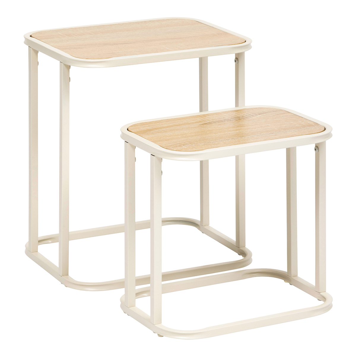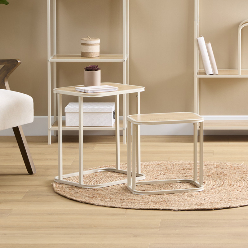 Ζιγκόν τραπεζάκια σε σετ 2 τεμαχίων για το χώρο του σαλονιού σας σε μπεζ απόχρωση με εκρού σκελετό. Ιδανικά για τοποθέτηση στη μέση του σαλονιού ή σε οποιοδήποτε άλλο χώρο σας ταιριάζουν. Μπορούν να δημιουργήσουν μαζί μια σύνθεση ή να τα χρησιμοποιήσετε χωριστά. Το προϊόν έρχεται αμοντάριστο και περιλαμβάνονται οι οδηγίες.