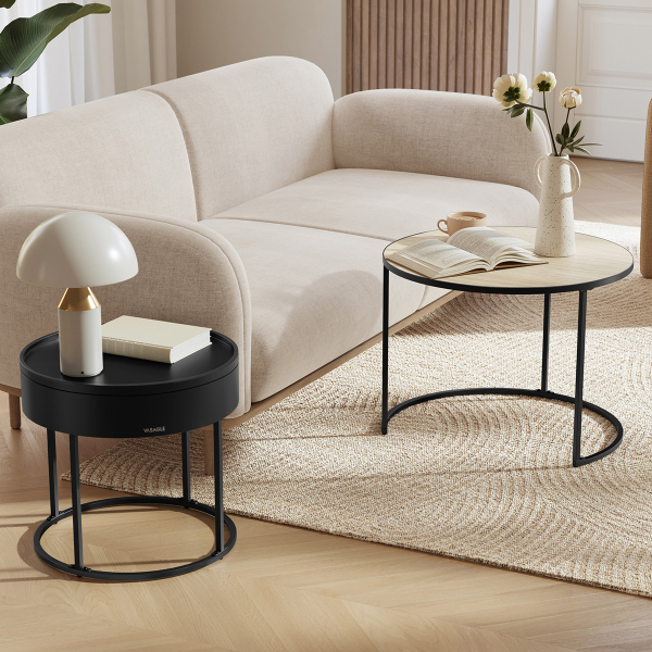 Τραπέζια σαλονιού - μέσης με μοντέρνο σχεδιασμό από την εταιρεία Vasagle. Έχουν μαύρο χρώμα ενώ το μεγάλο τραπέζι έχει επιφάνεια με φυσική απόχρωση ξύλου. Ιδανικά για το σαλόνι ή οποιοδήποτε άλλο χώρο σας ταιριάζουν. Μπορούν να δημιουργήσουν μαζί μια σύνθεση ή να τα χρησιμοποιήσετε μεμονωμένα. Τα προϊόντα έρχονται αμοντάριστα και συναρμολογούνται βάσει οδηγιών.