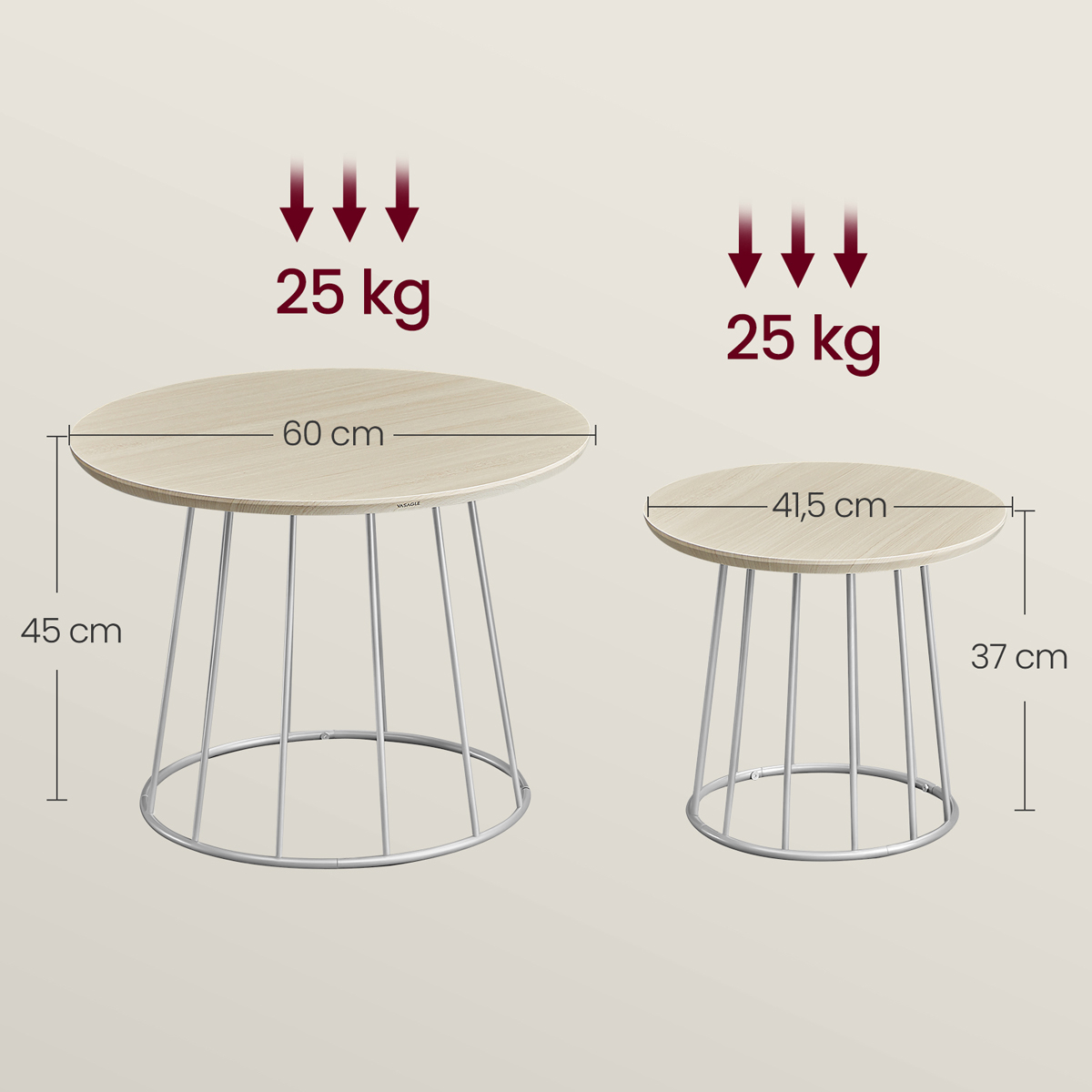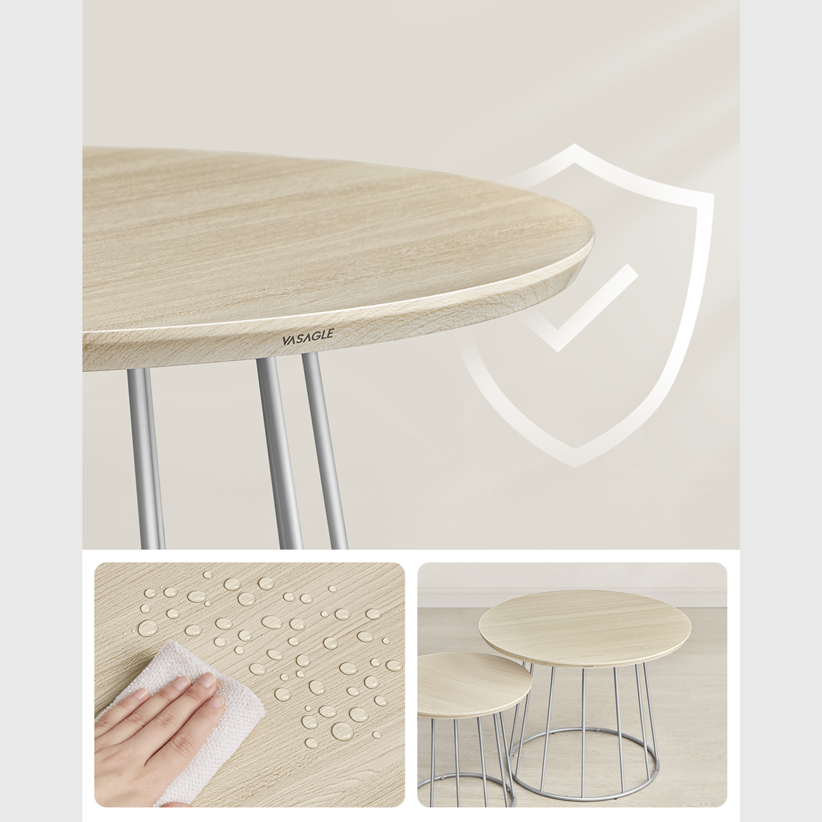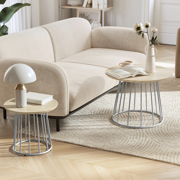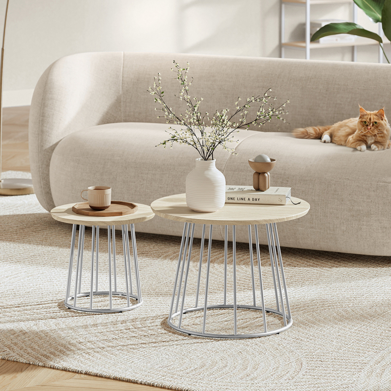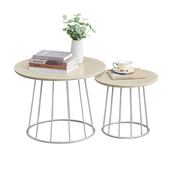 Τραπέζια σαλονιού - μέσης με μοντέρνο σχεδιασμό από την εταιρεία Vasagle. Έχουν ασημί βάση και επιφάνειες σε φυσικό χρώμα ξύλου. Ιδανικά για το σαλόνι ή σε οποιοδήποτε άλλο χώρο σας ταιριάζουν. Μπορούν να δημιουργήσουν μαζί μια σύνθεση ή να τα χρησιμοποιήσετε μεμονωμένα. Τα προϊόντα έρχονται αμοντάριστα και συναρμολογούνται βάσει οδηγιών.