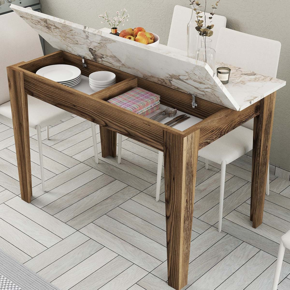 Τραπέζι κουζίνας με μοντέρνο σχεδιασμό, επιφάνεια με όψη μαρμάρου και πόδια σε σκούρο χρώμα καρυδιάς. Ο εργονομικός σχεδιασμός του σας προσφέρει αποθηκευτικό χώρο για να τοποθετήσετε ένα έξτρα σερβίτσιο, σουπλά, τραπεζομάντηλα ή ότι άλλο θέλετε. Κατασκευασμένο από υψηλής ποιότητας, ανθεκτικά υλικά που προσφέρουν αντοχή στην καθημερινή χρήση. Το προϊόν έρχεται αμοντάριστο και συναρμολογείται βάσει οδηγιών.
