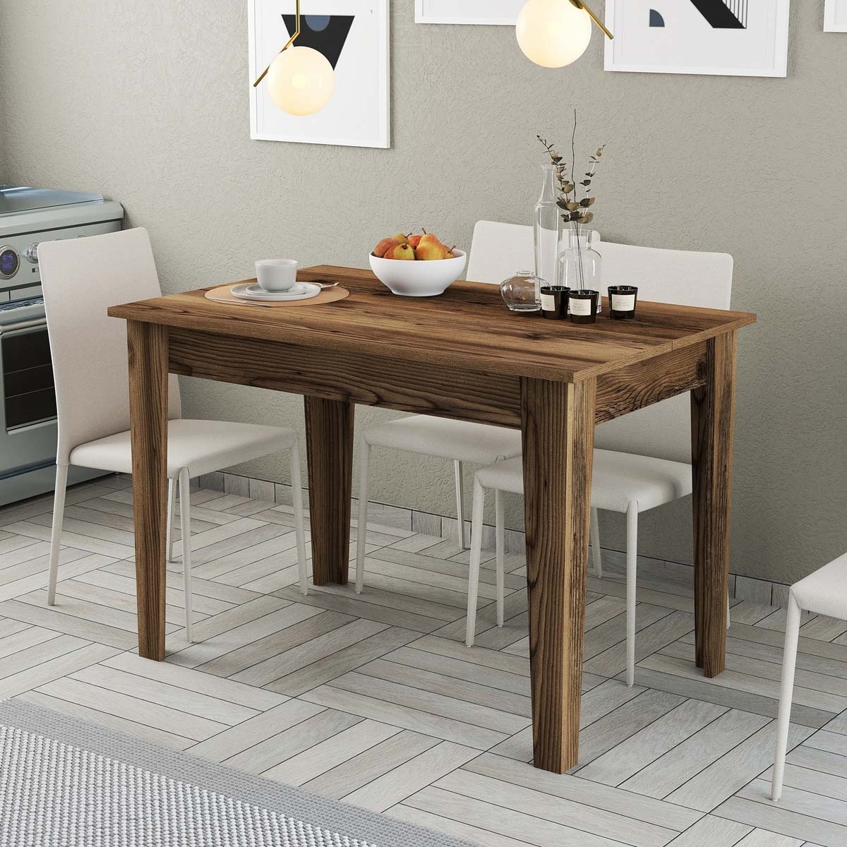 Τραπέζι κουζίνας με μοντέρνο σχεδιασμό σε σκούρο χρώμα καρυδιάς. Ο εργονομικός σχεδιασμός του σας προσφέρει αποθηκευτικό χώρο για να τοποθετήσετε ένα έξτρα σερβίτσιο, σουπλά, τραπεζομάντηλα ή ότι άλλο επιθυμείτε. Κατασκευασμένο από υψηλής ποιότητας, ανθεκτικά υλικά που προσφέρουν αντοχή στην καθημερινή χρήση. Το προϊόν έρχεται αμοντάριστο και συναρμολογείται βάσει οδηγιών.