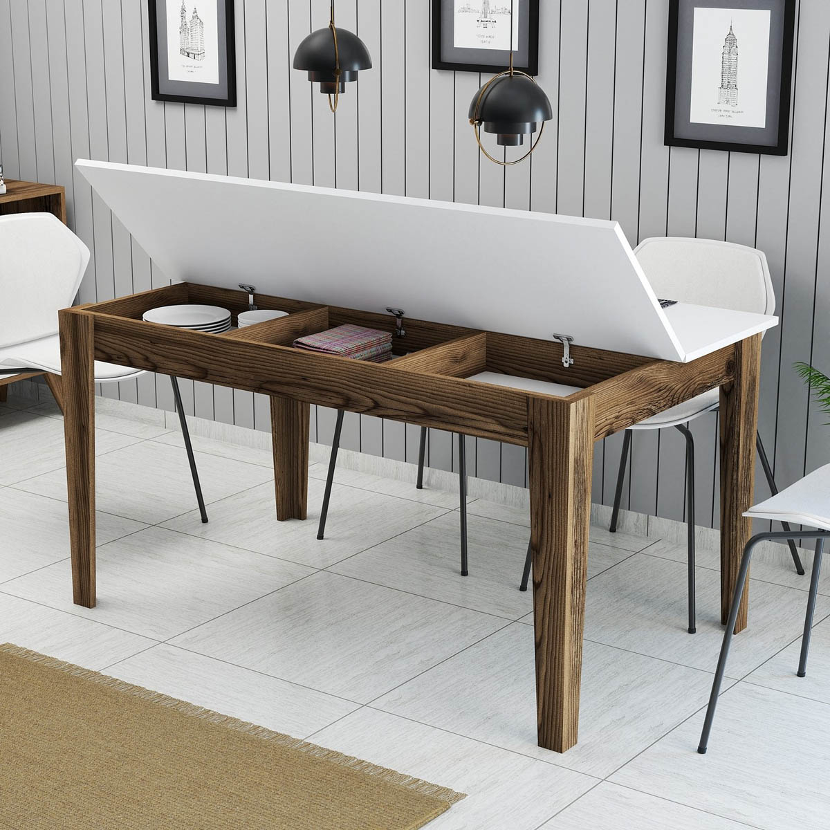 Τραπέζι κουζίνας με μοντέρνο σχεδιασμό σε καφέ απόχρωση με λευκή επιφάνεια. Ο εργονομικός σχεδιασμός του σας προσφέρει αποθηκευτικό χώρο για να τοποθετήσετε ένα έξτρα σερβίτσιο, σουπλά, τραπεζομάντηλα ή ότι άλλο θέλετε. Κατασκευασμένο από υψηλής ποιότητας, ανθεκτικά υλικά που προσφέρουν αντοχή στην καθημερινή χρήση. Το προϊόν έρχεται αμοντάριστο και συναρμολογείται βάσει οδηγιών.