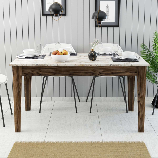 Τραπέζι κουζίνας με μοντέρνο σχεδιασμό, επιφάνεια με εφέ μαρμάρου και πόδια σε σκούρο χρώμα καρυδιάς. Ο εργονομικός σχεδιασμός του σας προσφέρει αποθηκευτικό χώρο για να τοποθετήσετε ένα έξτρα σερβίτσιο, σουπλά, τραπεζομάντηλα ή ότι άλλο θέλετε. Κατασκευασμένο από υψηλής ποιότητας, ανθεκτικά υλικά που προσφέρουν αντοχή στην καθημερινή χρήση. Το προϊόν έρχεται αμοντάριστο και συναρμολογείται βάσει οδηγιών.