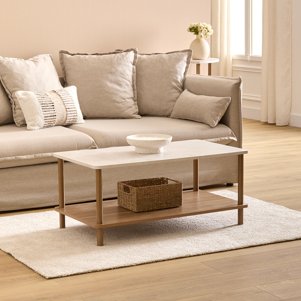 Τραπέζι σαλονιού κατασκευασμένο από ξύλο πεύκου και MDF, σε λευκό και μπεζ χρώμα. Διαθέτει ράφι στο κάτω μέρος για επιπλέον αποθηκευτικό χώρο. Συνδυάστε το με τα υπόλοιπα είδη του ίδιου σετ για μία αρμονική διακόσμηση. *Το προϊόν έρχεται αμοντάριστο και συναρμολογείται βάσει οδηγιών.*