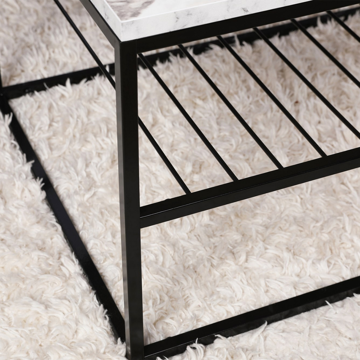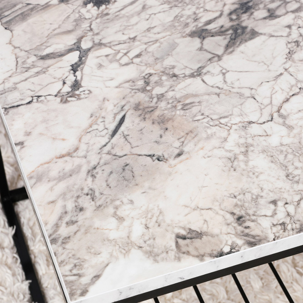 Τραπέζι μέσης με μοντέρνο σχεδιασμό σε μαύρο χρώμα και επιφάνεια με εφέ λευκού μαρμάρου. Διαθέτει ράφι για να τοποθετήσετε διάφορα πράγματα και να τακτοποιήσετε τον χώρο σας. Iδανικό για να στολίσει τον χώρο του καθιστικού σας, με ποιότητα και στυλ. Το προϊόν έρχεται αμοντάριστο και συναρμολογείται βάσει οδηγιών.