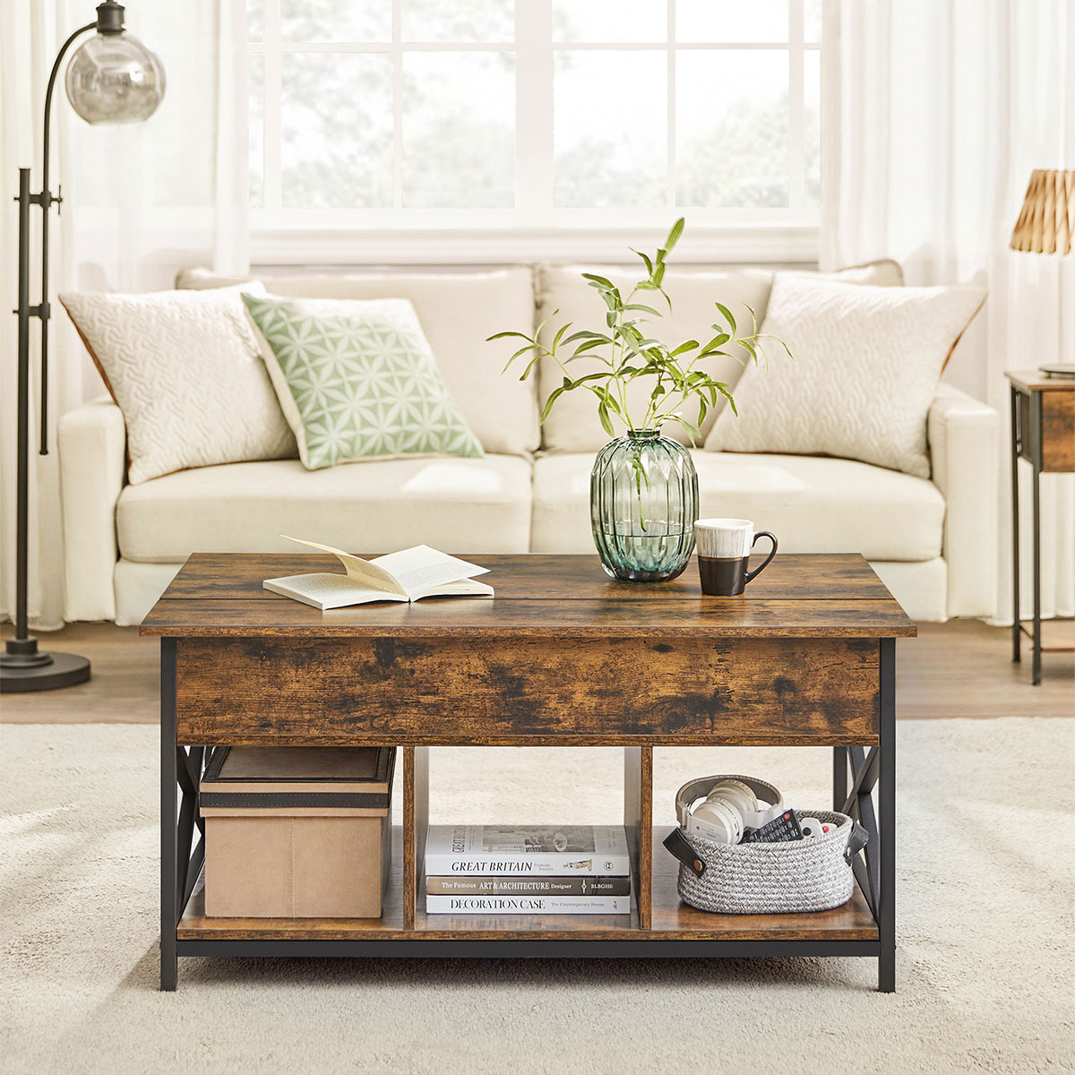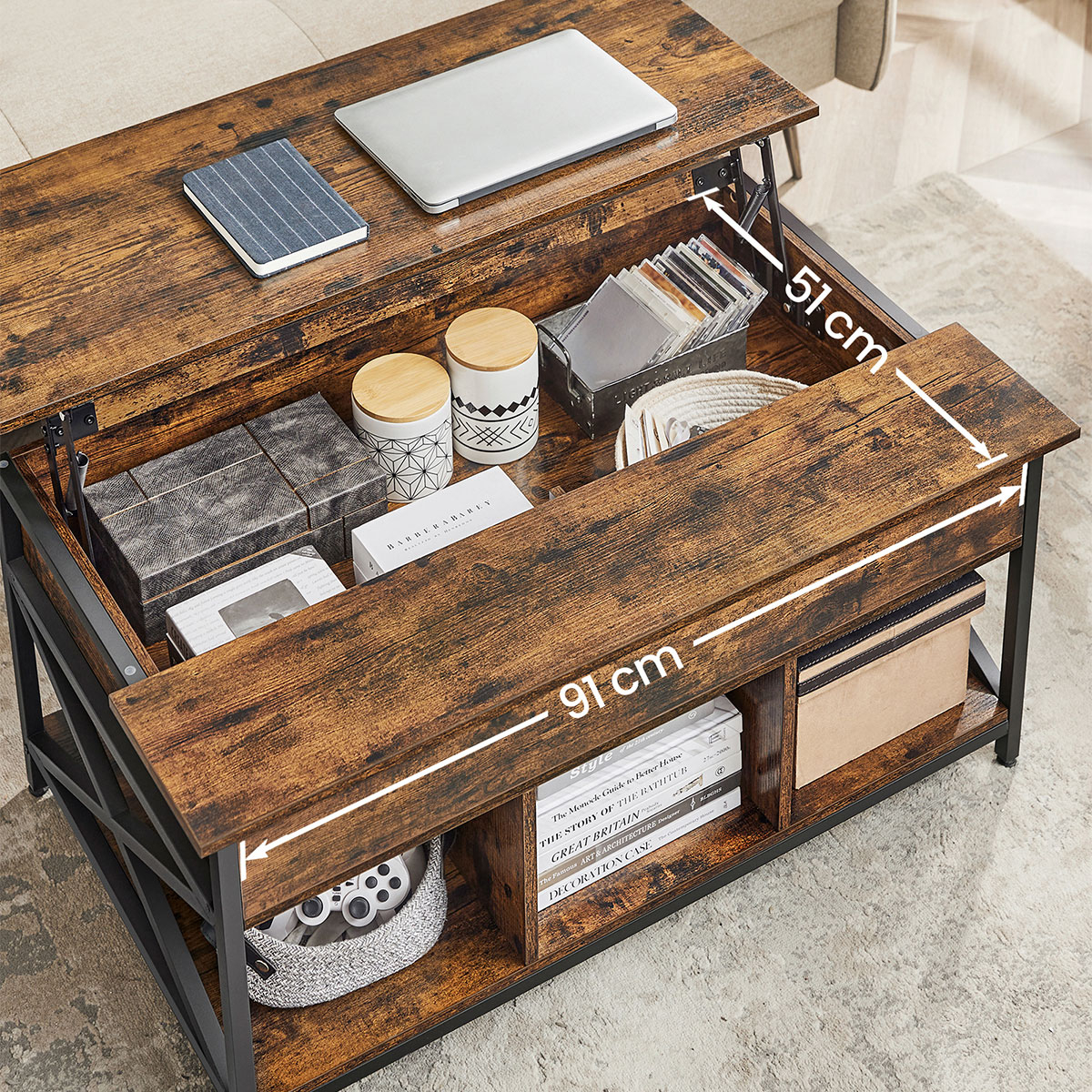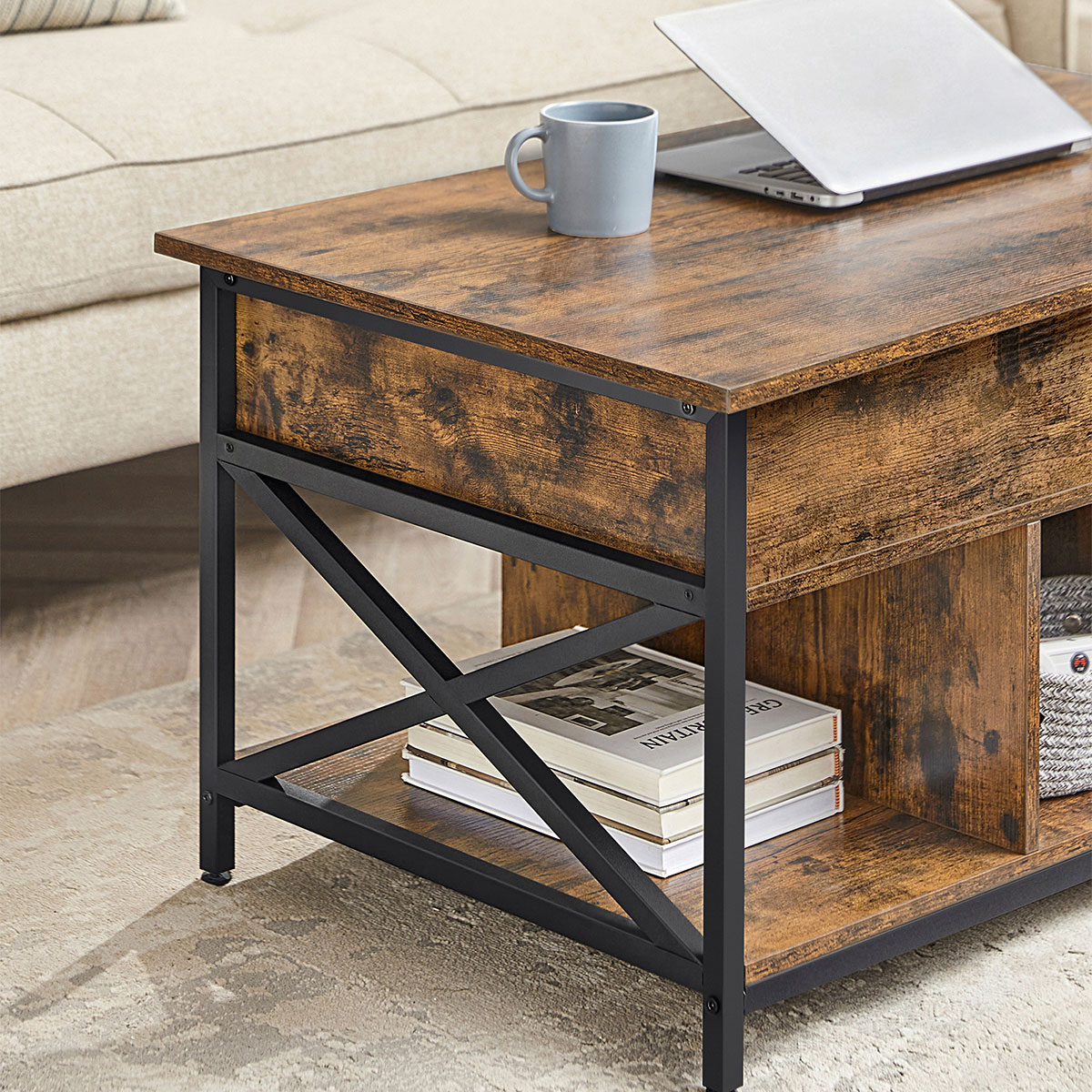 Τραπέζι μέσης με σερβιτόρο και μοντέρνο σχεδιασμό από την εταιρεία Vasagle. Είναι κατασκευασμένο από μοριοσανίδα σε καφέ ρουστίκ χρώμα με μαύρο μεταλλικό σκελετό. Διαθέτει 3 ράφια που προσθέτουν άφθονο αποθηκευτικό χώρο για να τοποθετήσετε το τηλεχειριστήριο, διάφορα βιβλία, περιοδικά κτλ. Η επάνω επιφάνεια σηκώνεται με μηχανισμό και δημιουργείται σερβιτόρος για να ακουμπήσετε το φαΐ σας ή το laptop σας ενώ παράλληλα δημιουργείται και κρυφός αποθηκευτικός χώρος. Τα πόδια είναι ρυθμιζόμενα για να προσαρμόζεται το τραπεζάκι σε οποιαδήποτε επιφάνεια και να παραμένει σταθερό και έχουν τάπες για να μην φθείρουν το πάτωμα. Ιδανικό για να προσθέτει στυλ και ποιότητα στο σαλόνι σας. *Το προϊόν έρχεται αμοντάριστο.*