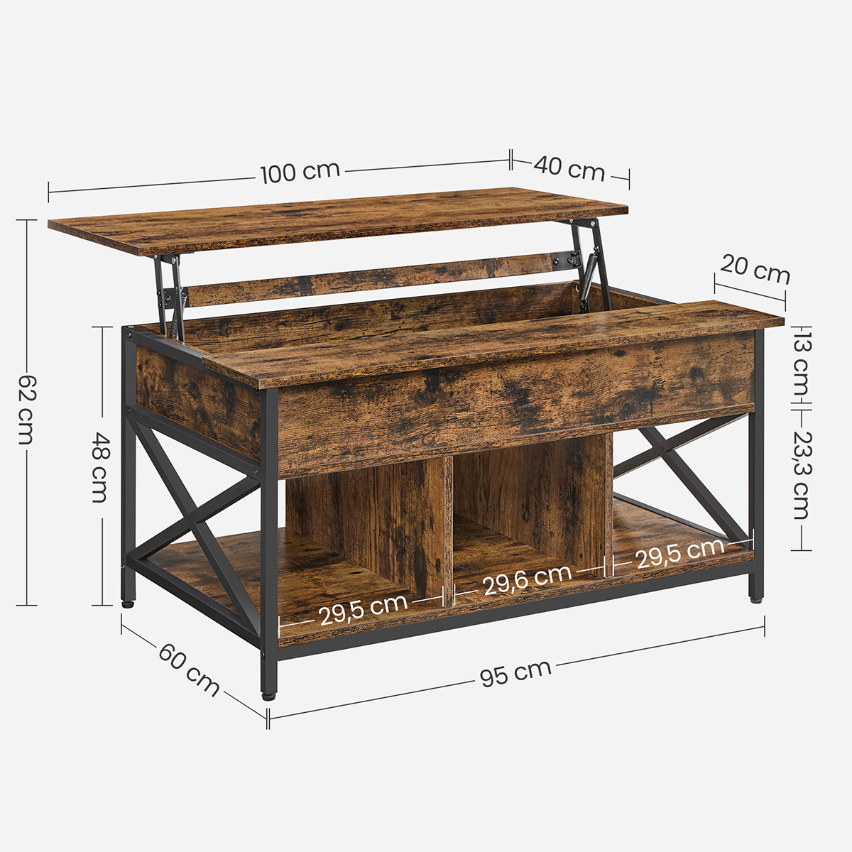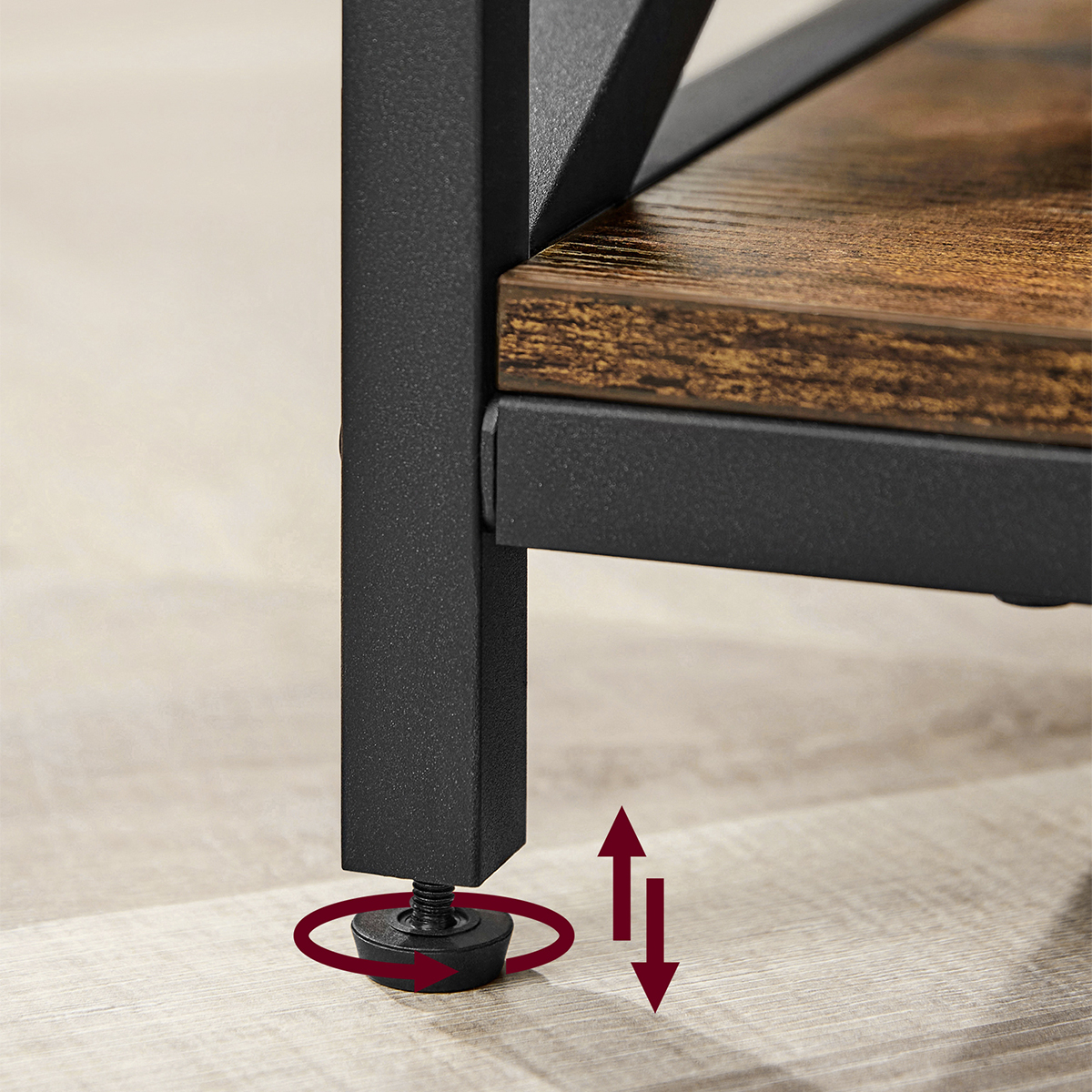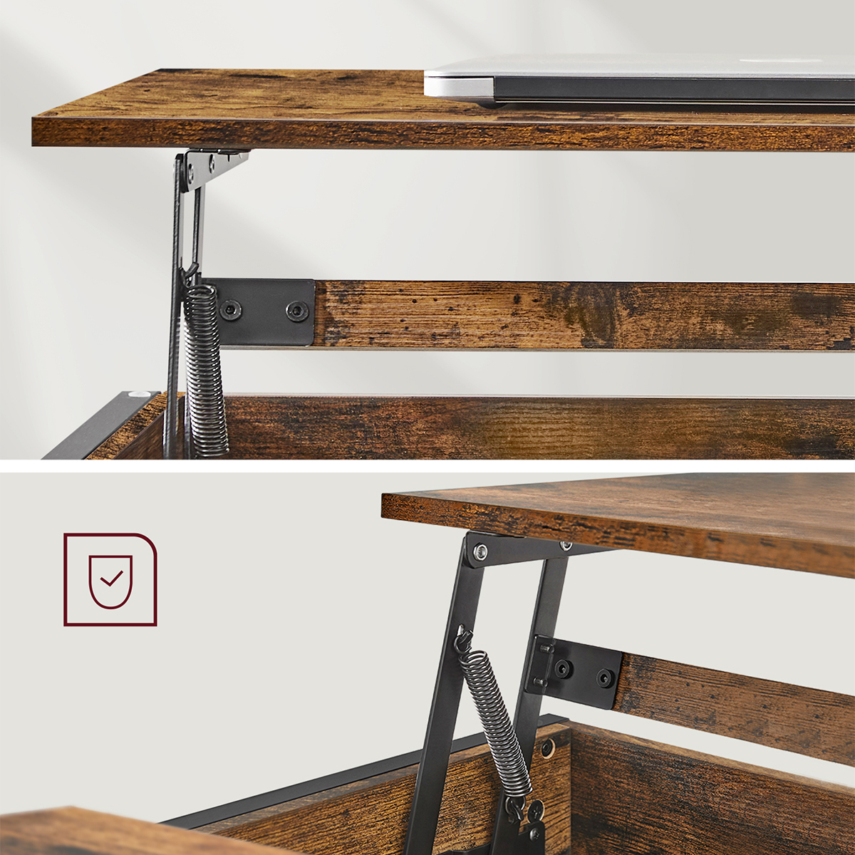 Τραπέζι μέσης με σερβιτόρο και μοντέρνο σχεδιασμό από την εταιρεία Vasagle. Είναι κατασκευασμένο από μοριοσανίδα σε καφέ ρουστίκ χρώμα με μαύρο μεταλλικό σκελετό. Διαθέτει 3 ράφια που προσθέτουν άφθονο αποθηκευτικό χώρο για να τοποθετήσετε το τηλεχειριστήριο, διάφορα βιβλία, περιοδικά κτλ. Η επάνω επιφάνεια σηκώνεται με μηχανισμό και δημιουργείται σερβιτόρος για να ακουμπήσετε το φαΐ σας ή το laptop σας ενώ παράλληλα δημιουργείται και κρυφός αποθηκευτικός χώρος. Τα πόδια είναι ρυθμιζόμενα για να προσαρμόζεται το τραπεζάκι σε οποιαδήποτε επιφάνεια και να παραμένει σταθερό και έχουν τάπες για να μην φθείρουν το πάτωμα. Ιδανικό για να προσθέτει στυλ και ποιότητα στο σαλόνι σας. *Το προϊόν έρχεται αμοντάριστο.*