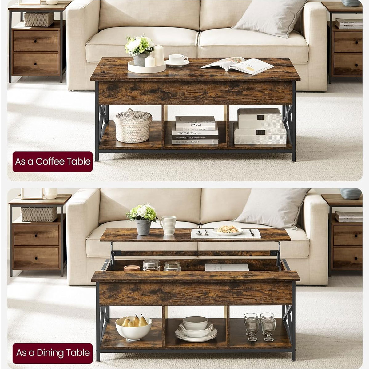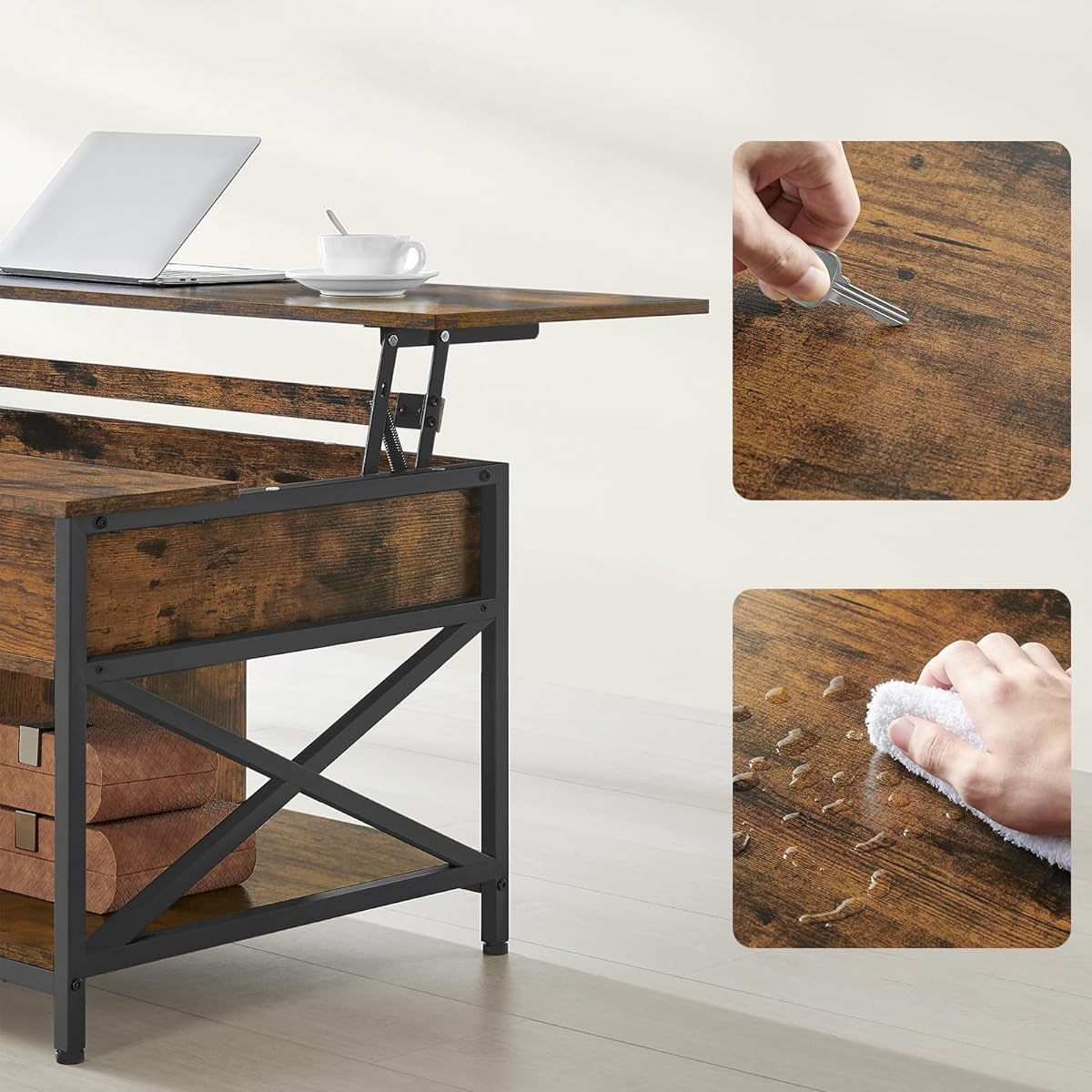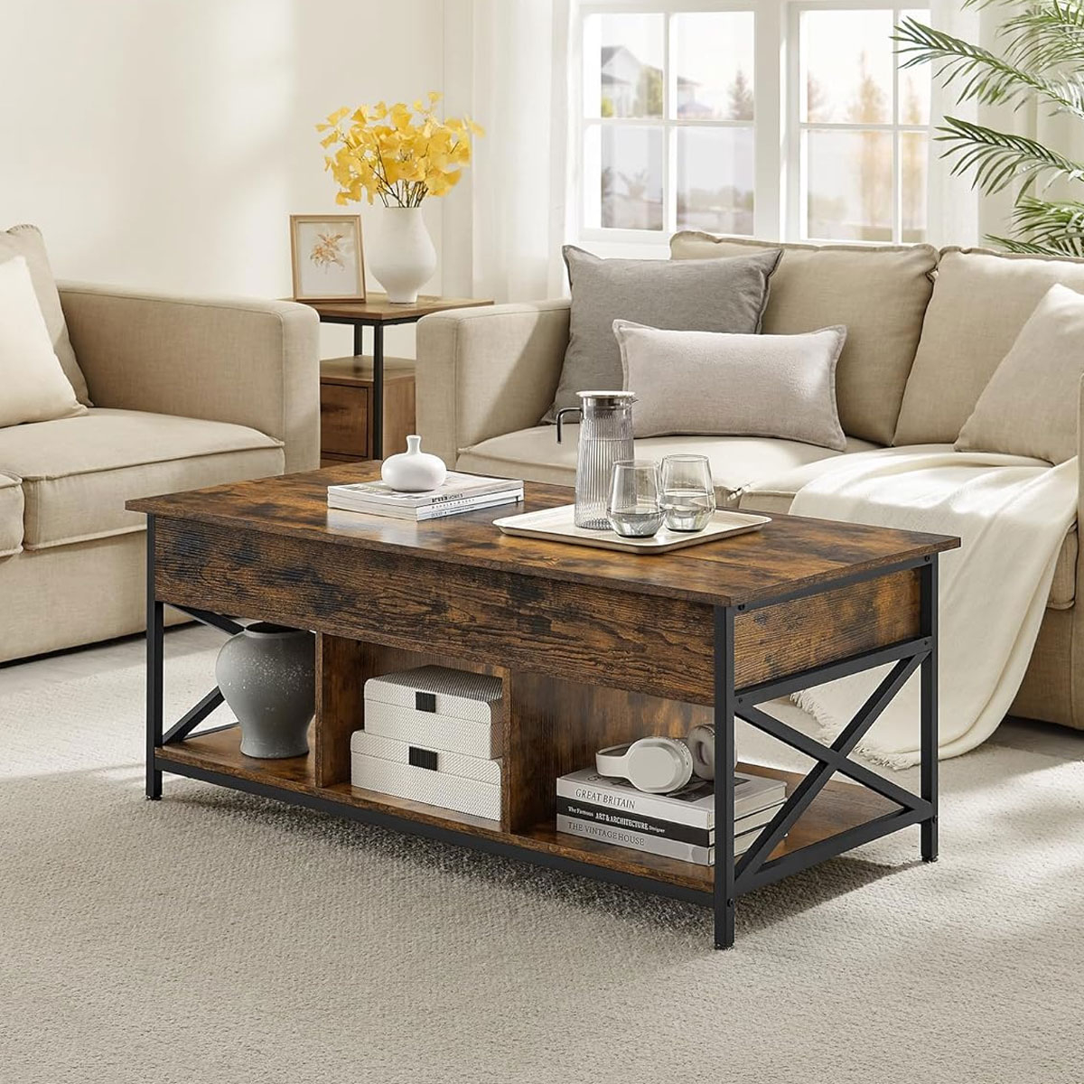 Τραπέζι μέσης με μοντέρνο σχεδιασμό από την εταιρεία Vasagle σε φυσικό χρώμα και μαύρο σκελετό. Διαθέτει αποθηκευτικούς χώρους και σερβιτόρο για να ακουμπήσετε το φαγητό ή το laptop σας. Ιδανικό για να προσθέσει στυλ και ποιότητα στο σαλόνι σας. Το προϊόν έρχεται αμοντάριστο και συναρμολογείται βάσει οδηγιών.