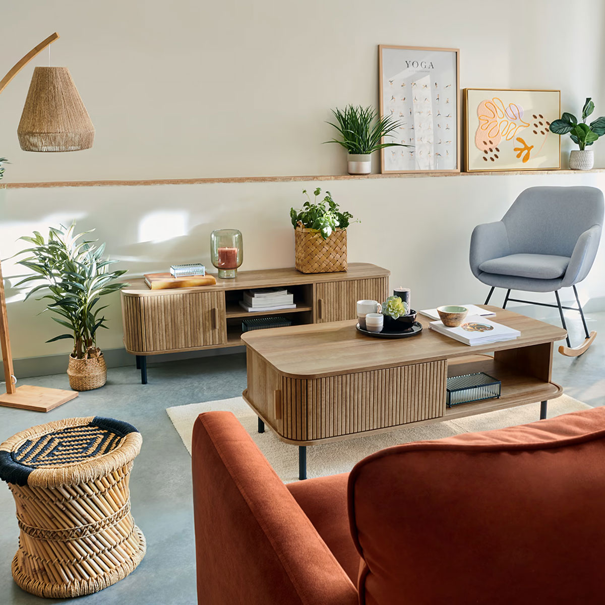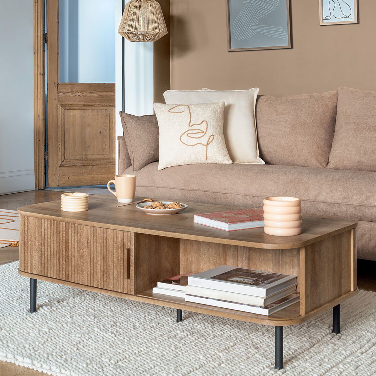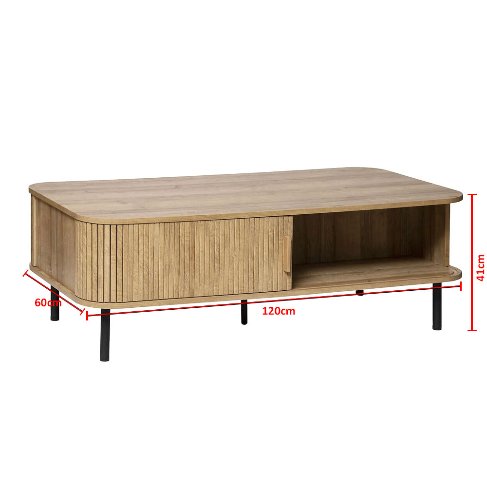 Τραπέζι μέσης για το χώρο του σαλονιού σε φυσικό χρώμα ξύλου. Διαθέτει ραφάκια και ντουλάπι για να αποθηκεύετε τα πράγματα σας και να διατηρείτε τακτοποιημένο τον χώρο σας. Ένα έπιπλο με μοντέρνο σχεδιασμό που μπορεί να τοποθετηθεί στο κέντρο του σαλονιού μπροστά από τον καναπέ σας. Το προϊόν έρχεται αμοντάριστο και συναρμολογείται βάσει οδηγιών.