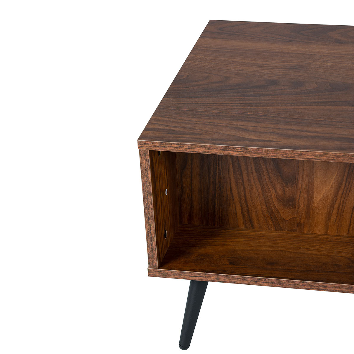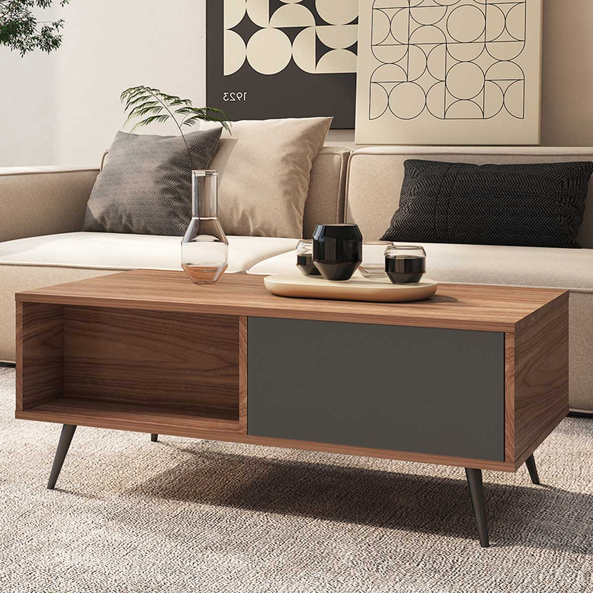 Τραπέζι μέσης σε καφέ απόχρωση ξύλου. Έχει αποθηκευτικό χώρο για να τακτοποιήσετε και να οργανώσετε τον χώρο σας. Ο μοντέρνος σχεδιασμός του το καθιστά ιδανικό για τον χώρο του σαλονιού σας, καθώς ταιριάζει με όλα τα είδη διακόσμησης. Το προϊόν έρχεται αμοντάριστο και συναρμολογείται βάσει οδηγιών.