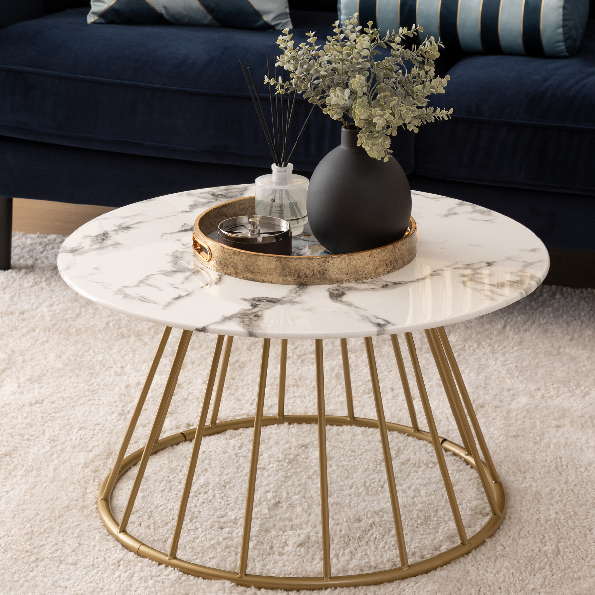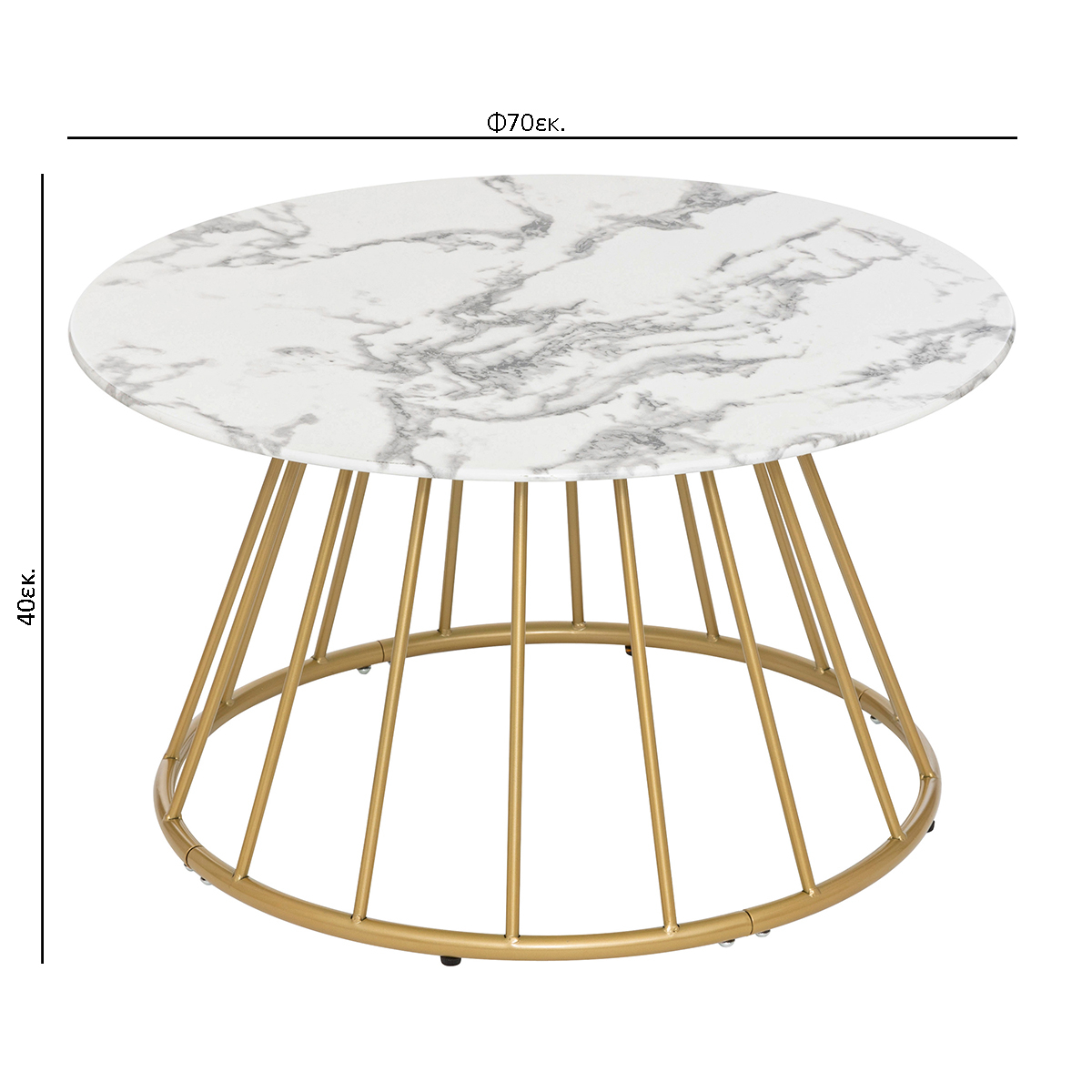 Τραπέζι μέσης με μοντέρνο σχεδιασμό σε χρυσό χρώμα και επιφάνεια με εφέ μαρμάρου. Ιδανικό για τον χώρο του καθιστικού σας καθώς θα προσφέρει κομψότητα και λειτουργικότητα. Συνδυάστε το με τα υπόλοιπα είδη της ίδιας συλλογής για ένα ολοκληρωμένο αποτέλεσμα στον χώρο σας. Το προϊόν έρχεται αμοντάριστο και συναρμολογείται βάσει οδηγιών.