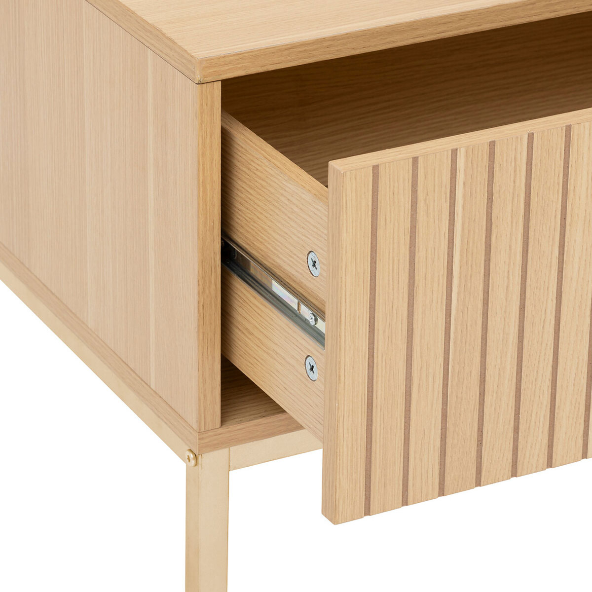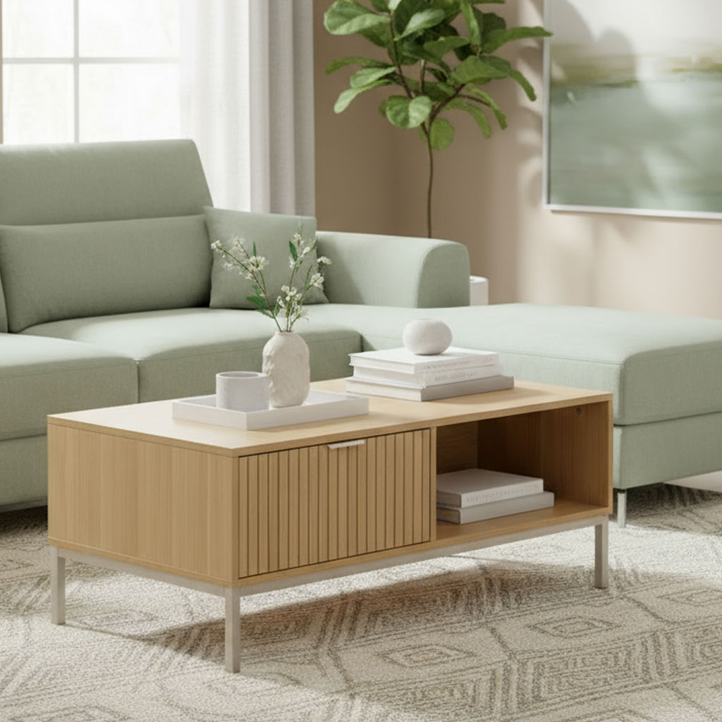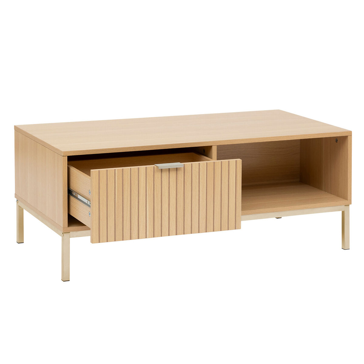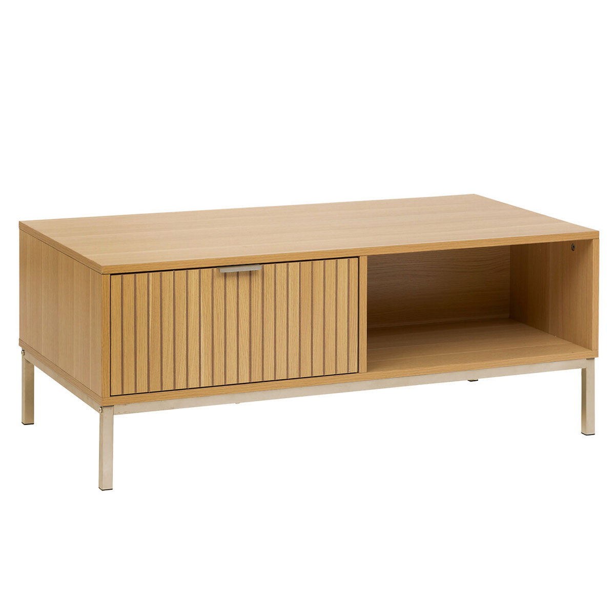 Τραπέζι μέσης σε φυσική απόχρωση ξύλου που προσδίδει ζεστασιά στον χώρο σας. Διαθέτει αποθηκευτικό χώρο για τα περιοδικά, τα βιβλία και άλλα μικροαντικείμενα. Έχει μίνιμαλ σχεδιασμό και είναι ιδανικό για το σαλόνι σας καθώς ταιριάζει με όλα τα είδη διακόσμησης. Το προϊόν έρχεται αμοντάριστο και συναρμολογείται βάσει οδηγιών.