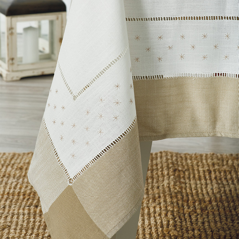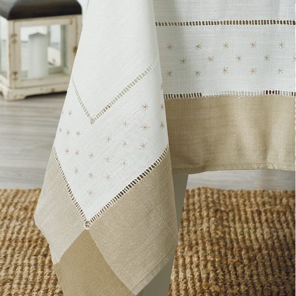 Σετ τραπεζιού σε λευκό χρώμα με μπεζ φάσα και μοντέρνο σχέδιο από την εταιρεία Whitegg. Το ύφασμά του είναι από 100% βαμβάκι που το καθιστά μαλακό και ανθεκτικό. Το σετ περιλαμβάνει καρέ, τραπεζοκαρέ, 2 πετσετάκια 40x40, 2 πετσετάκια 60x60 και 1 runner 40x190.