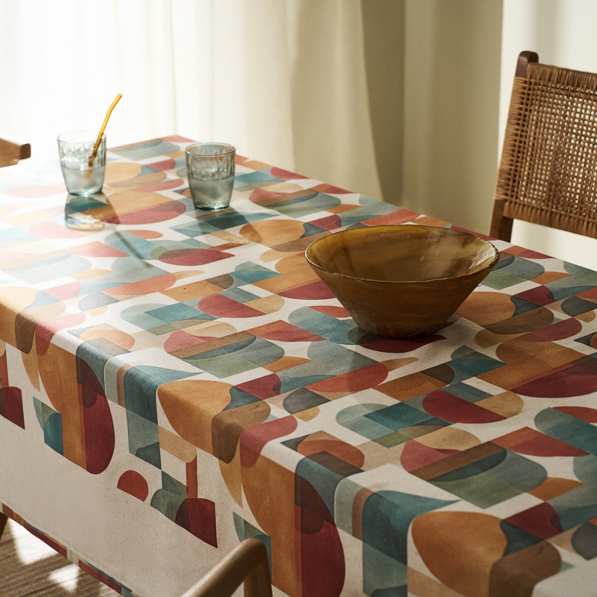 Τραπεζομάντηλο 135x180 από την εταιρεία Gofis Home με γεωμετρικό σχέδιο σε πράσινες-μπεζ-μπορντώ αποχρώσεις και εκρού φόντο. Είναι κατασκευασμένο από ύφασμα σύνθεσης 50% polyester 40% βαμβάκι και 10% λινό, με ανεξίτηλα χρώματα. Φινιρισμένο με θερμό αέρα για ύφασμα με μαλακή και χυτή αίσθηση. Ιδανικό για να στολίσει το τραπέζι της κουζίνας ή της τραπεζαρίας σας δίνοντας μια ιδιαίτερη πινελιά στο χώρο.