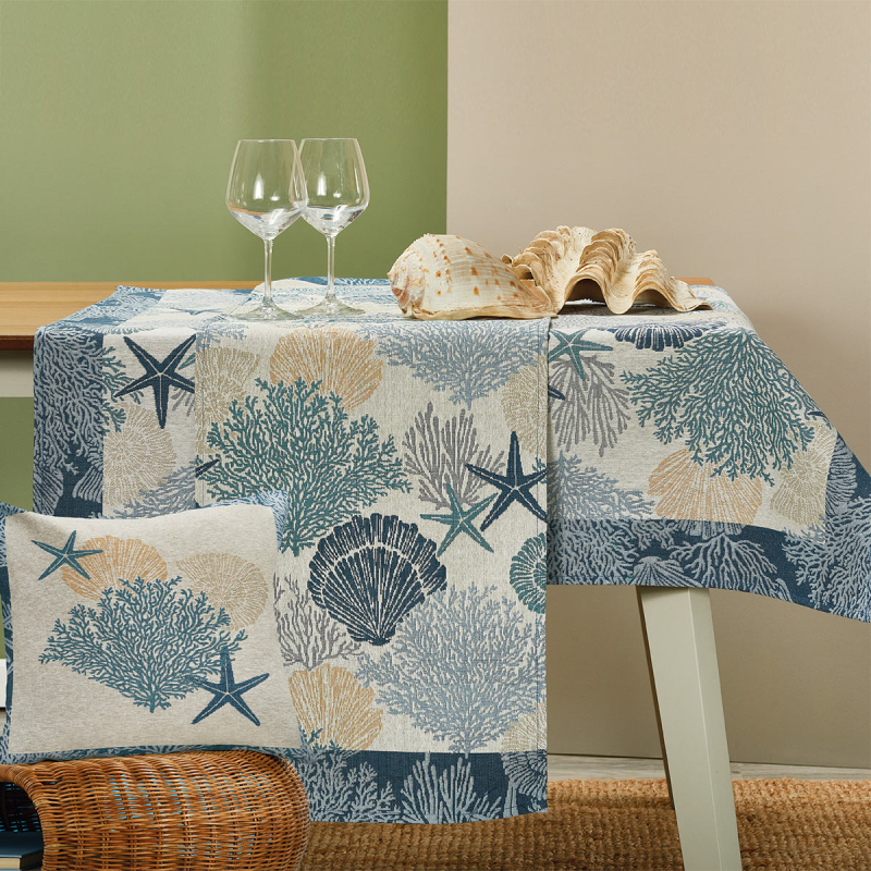 Τραπεζομάντηλο 140x200 σε μπλε-γαλάζιες αποχρώσεις με μοντέρνο σχέδιο και πράσινες-μπεζ λεπτομέρειες από την εταιρεία Whitegg. Ύφασμα στόφα με σύνθεση από 50% βαμβάκι και 50% polyester. Συνδυάστε το με τα υπόλοιπα προϊόντα του ίδιου σετ για ένα ολοκληρωμένο αποτέλεσμα.