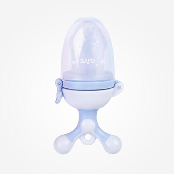 Τροφοδότης φαγητού σε σιέλ χρώμα από την εταιρία Saro. Κατασκευασμένο από 100% μαλακή σιλικόνη χωρίς BPA, είναι απόλυτα ασφαλές για τα μικρά παιδιά. Απλώς τοποθετείτε το φαγητό που θέλετε, κλείνετε τις λαβές και περιστρέφετε την βάση για να πολτοποιήσετε το φαγητό. Έχει καινοτόμο σύστημα περιστροφής που σπρώξει το φαγητό με ευκολία χωρίς να συσσωρεύετε στο κάτω μέρος. Με αυτόν τον τρόπο μπορεί το παιδί σας να ανακαλύψτε άφοβα νέες γεύσεις αλλά και να ανακουφίσει τους πόνους των δοντιών και των ούλων. Διαθέτει πρακτικό καπάκι για να διατηρεί το στόμιο καθαρό, ενώ δεν απορροφούνται οσμές ή γεύσεις. Είναι εύκολο στο καθάρισμα, ενώ οι τρύπες που έχει το στόμιο βοηθούν το παιδί σας να φάει άφοβα. Έχει ιδανικό μέγεθος για να μπορεί το μικρό σας να τρώει μόνο του. Κατάλληλο για ηλικίες 6+ μηνών.