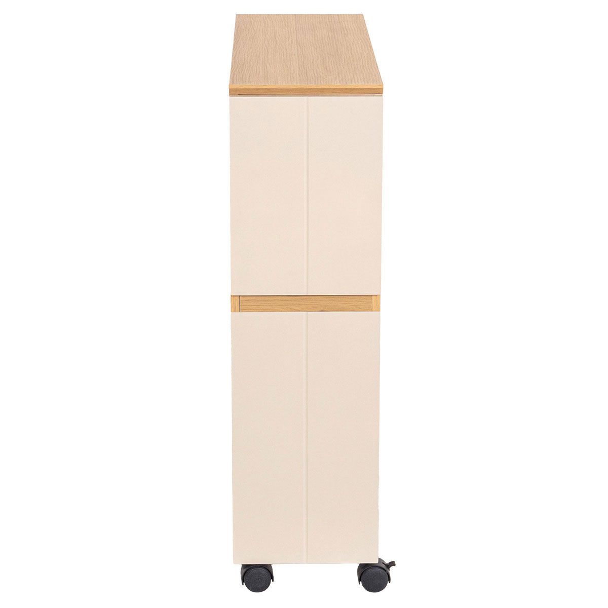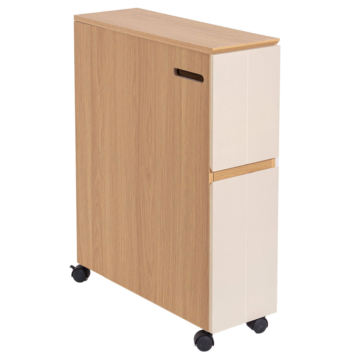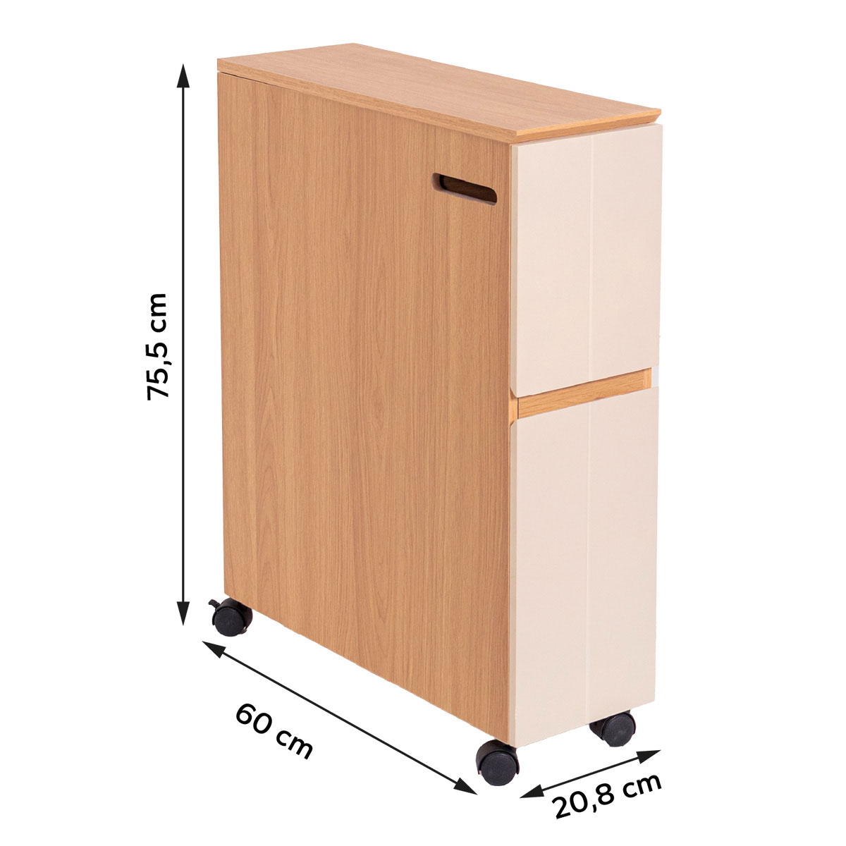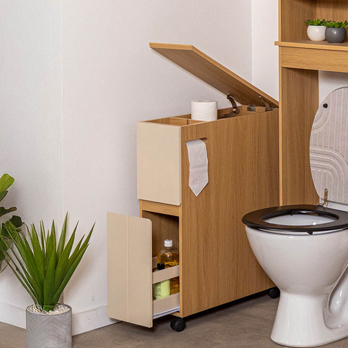 Τρόλεϊ - ραφιέρα με ροδάκια, κατασκευασμένο από ξύλο MDF σε καφέ χρώμα με μπεζ μαύρες λεπτομέρειες. Το επάνω μέρος διαθέτει ανακλινόμενο καπάκι με μηχανισμό στήριξης για ασφαλές και σταθερό άνοιγμα, προσφέροντας εύκολη πρόσβαση στον εσωτερικό αποθηκευτικό χώρο. Είναι ιδανικό για χαρτιά υγείας, ανταλλακτικά ρολά ή άλλα απαραίτητα είδη καθημερινής χρήσης. Στο κάτω μέρος διαθέτει συρτάρι με ενιαίο χώρο για καλύτερη οργάνωση καθαριστικών και αξεσουάρ, ενώ η πλαϊνή εγκοπή λειτουργεί ως πρακτική θήκη για ρολό χαρτιού με δυνατότητα τοποθέτησης και στις 2 πλευρές. Τα ενσωματωμένα ροδάκια επιτρέπουν εύκολη μετακίνηση, διευκολύνοντας το καθάρισμα και την αλλαγή θέσης. Μια πρακτική και κομψή επιλογή που εκμεταλλεύεται ιδανικά τον διαθέσιμο χώρο, χαρίζοντας οργάνωση και αισθητική αρμονία στο μπάνιο σας. Συνδυάστε το με τα υπόλοιπα προϊόντα στο ίδιο σετ για ένα ολοκληρωμένο αποτέλεσμα. *Το προϊόν έρχεται αμοντάριστο και περιλαμβάνονται οι οδηγίες.*
