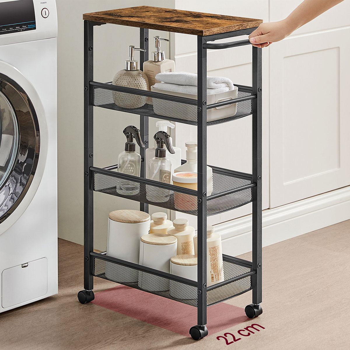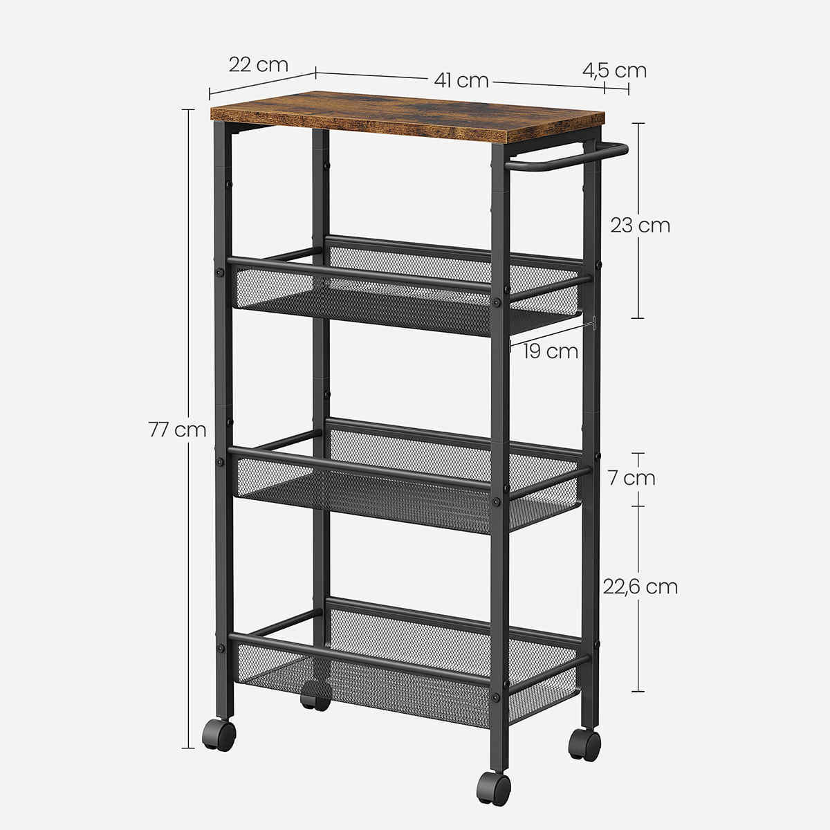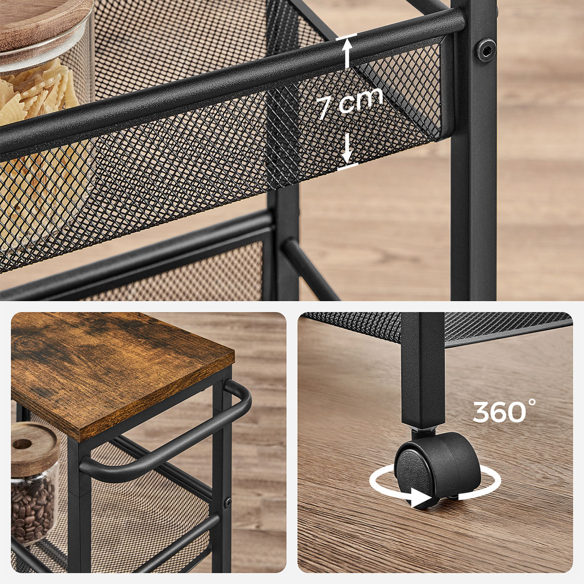 Τρόλεϊ - ραφιέρα 3 επιπέδων από την εταιρεία Vasagle. Είναι κατασκευασμένο από μοριοσανίδα σε ρουστίκ καφέ χρώμα με μαύρο μεταλλικό σκελετό. Διαθέτει λαβή και 4 ροδάκια με στοπ για εύκολη μεταφορά. Μπορεί να χρησιμοποιηθεί σαν βοηθητικό έπιπλο κουζίνας για οργάνωση τροφίμων ή άλλων χρηστικών ειδών, για την οργάνωση μπάνιου κλπ. Μέγιστο βάρος αντοχής ανά ράφι: 5kg. Συνολικό μέγιστο βάρος αντοχής: 20kg. *Το προϊόν έρχεται αμοντάριστο και συναρμολογείται βάσει οδηγιών.*