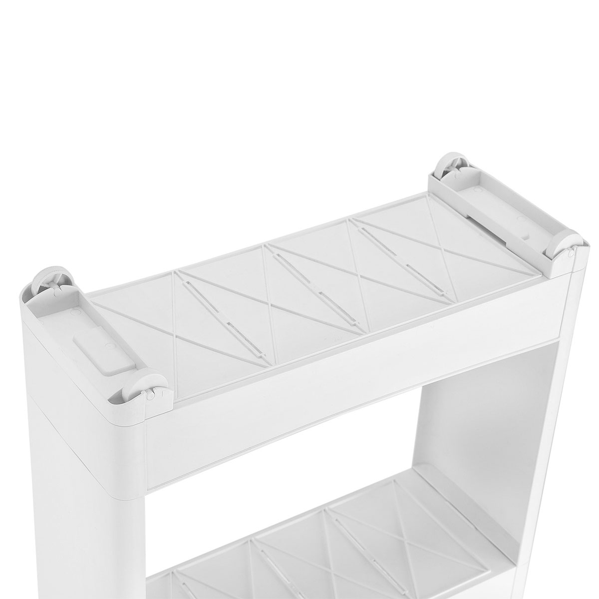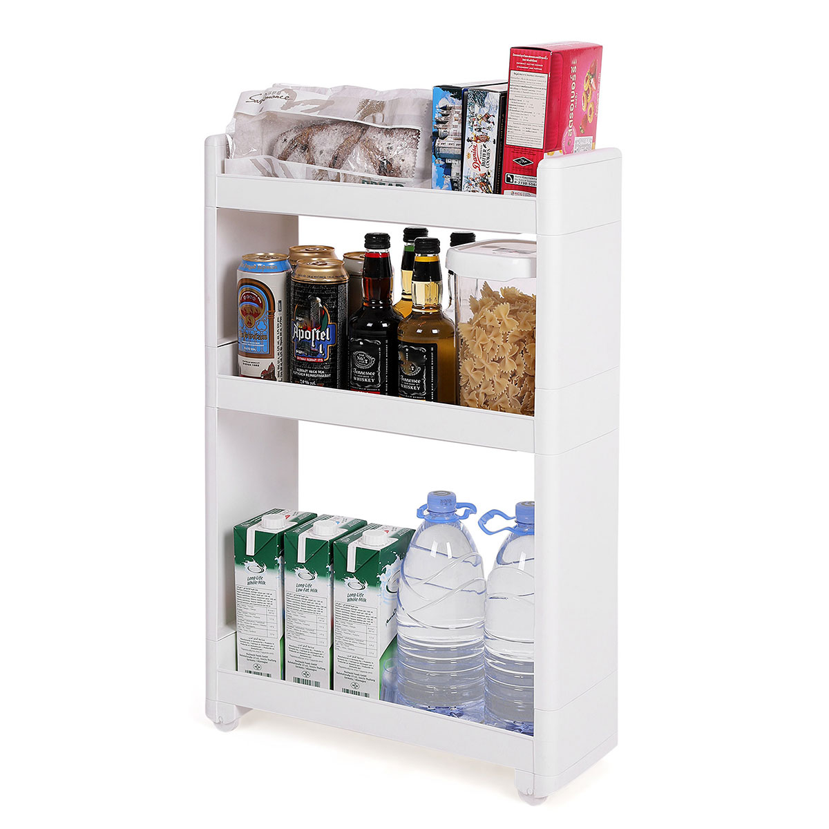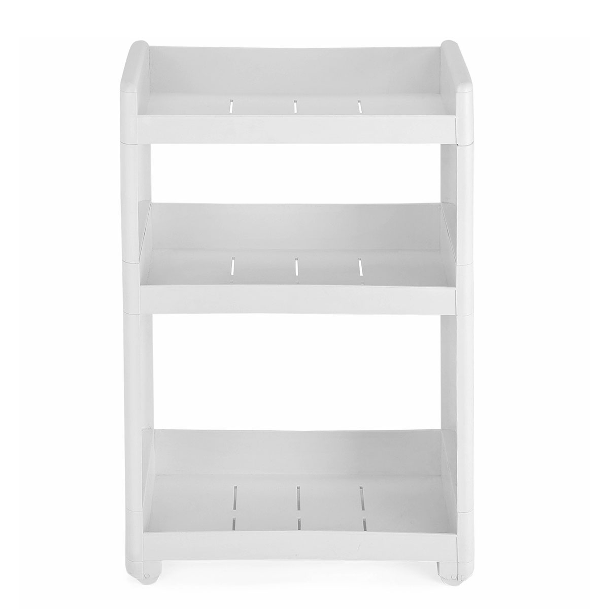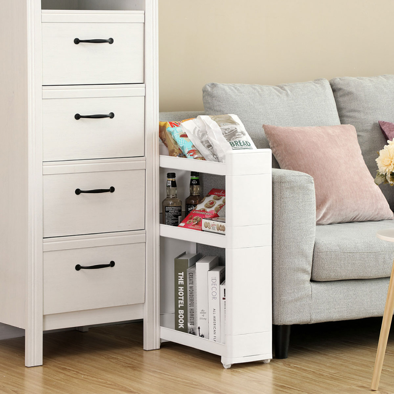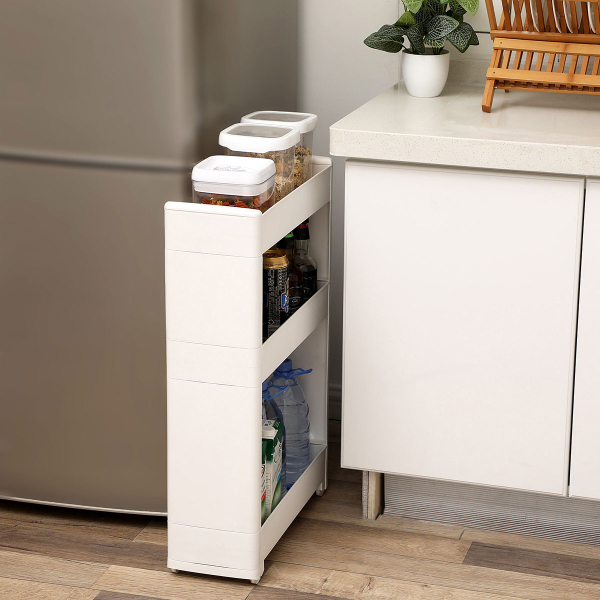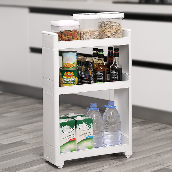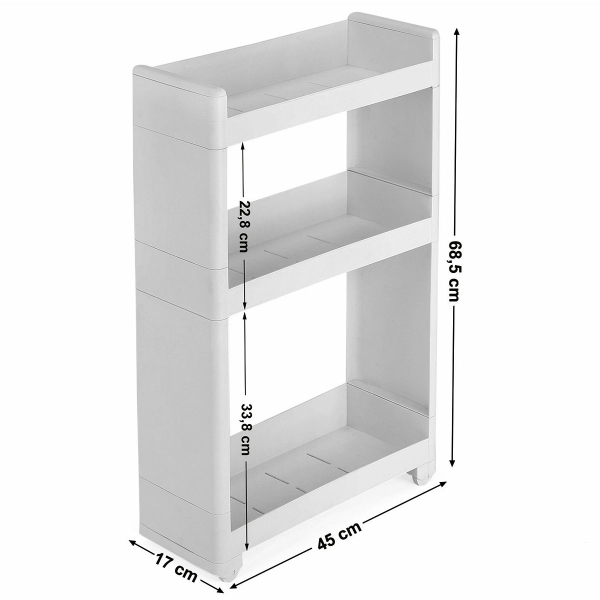 Τρόλεϊ - ραφιέρα με 3 ορόφους από την εταιρεία Songmics. Είναι κατασκευασμένο από πλαστικό υλικό σε λευκό χρώμα. Διαθέτει ροδάκια για εύκολη μετακίνηση. Μπορεί να χρησιμοποιηθεί σαν βοηθητικό έπιπλο κουζίνας για οργάνωση τροφίμων ή άλλων χρηστικών ειδών, στο μπάνιο για τις πετσέτες, τα σαμπουάν κλπ. Ιδανικό τρόλει για σπίτια με περιορισμένο χώρο. Μέγιστο συνολικό βάρος 15kg. *Το προϊόν έρχεται αμοντάριστο και συναρμολογείται βάσει οδηγιών.*