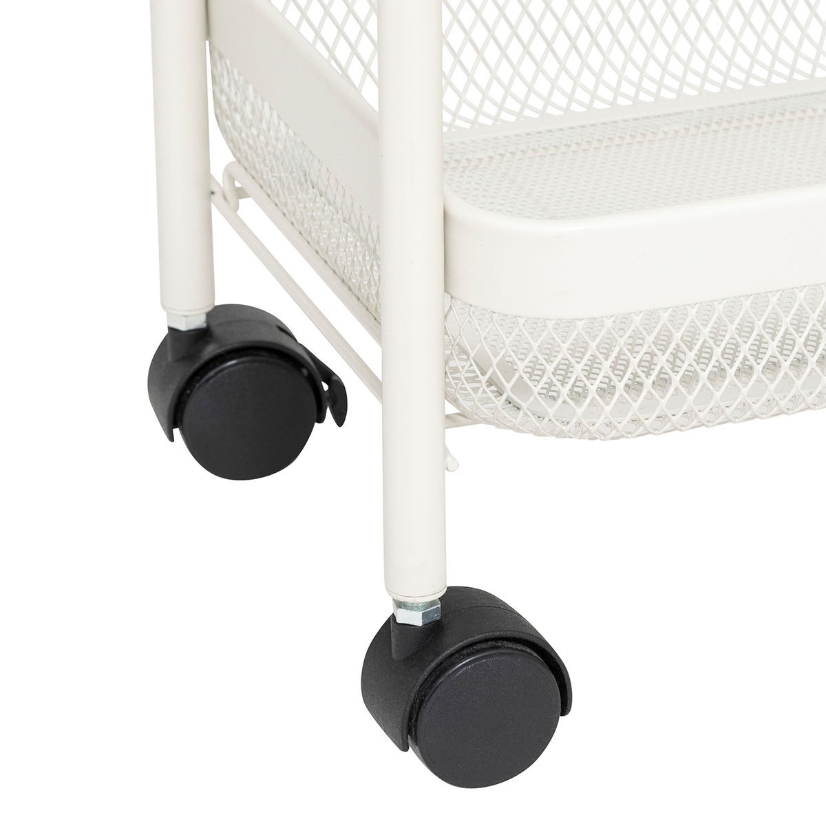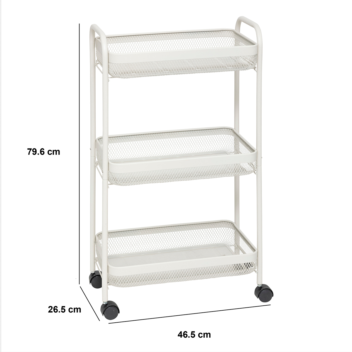 Τρόλεϊ - ραφιέρα με 3 ορόφους κατασκευασμένο από μέταλλο σε εκρού χρώμα. Διαθέτει λαβές για εύκολη μεταφορά και ροδάκια με στοπ για μέγιστη σταθερότητα. Μπορεί να χρησιμοποιηθεί σαν βοηθητικό έπιπλο κουζίνας για οργάνωση τροφίμων ή άλλων χρηστικών ειδών, στο μπάνιο για τις πετσέτες, τα σαμπουάν κλπ. Ακόμη μπορεί να τοποθετηθεί στο γραφείο για να οργανώσετε τον χώρο σας. Συνδυάστε το με τα υπόλοιπα είδη της ίδιας σειράς για ένα ολοκληρωμένο αποτέλεσμα. *Το προϊόν έρχεται αμοντάριστο και συναρμολογείται βάσει οδηγιών.*